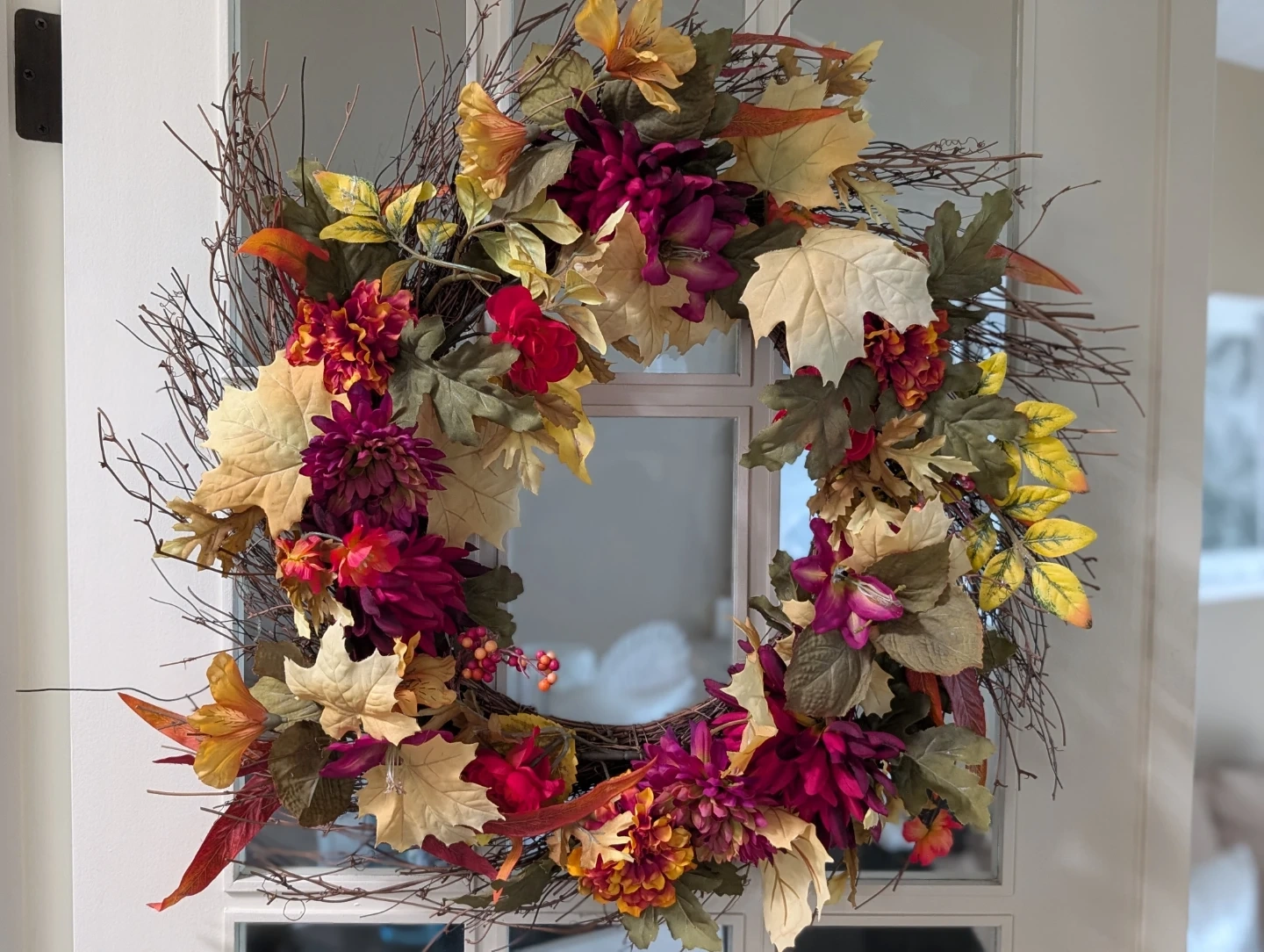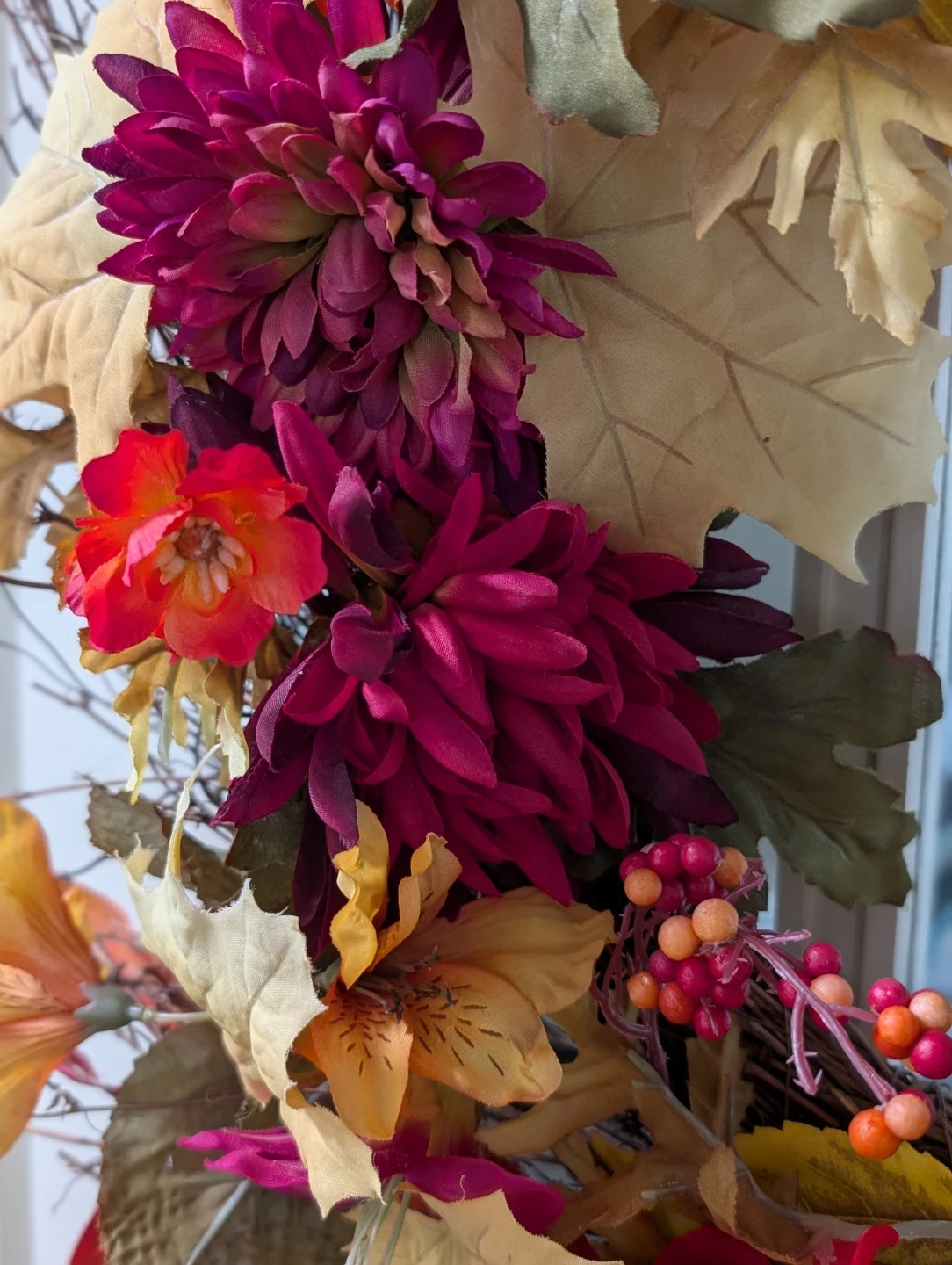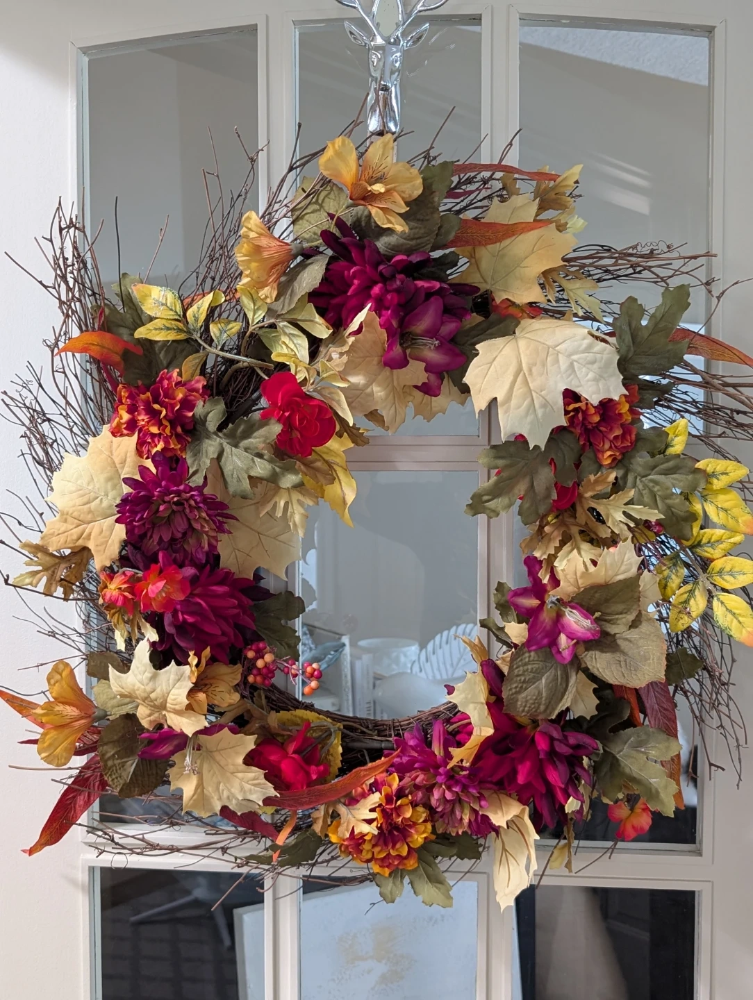 This stunning, grapevine wreath, made up of high quality silk flowers, leaves, and berries suits any and all seasons! Its blend of beautiful colours makes it a compliment to any decor!