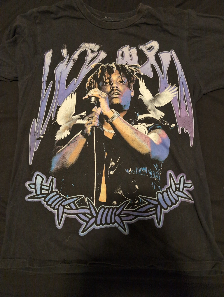 Selling a Juice WRLD graphic t-shirt. This black tee features a print of the artist with doves and barbed wire. It's in used condition, so please check out the photos for details selling more please look at bio. Will sell for extremely cheap in a bundle of clothes with offers