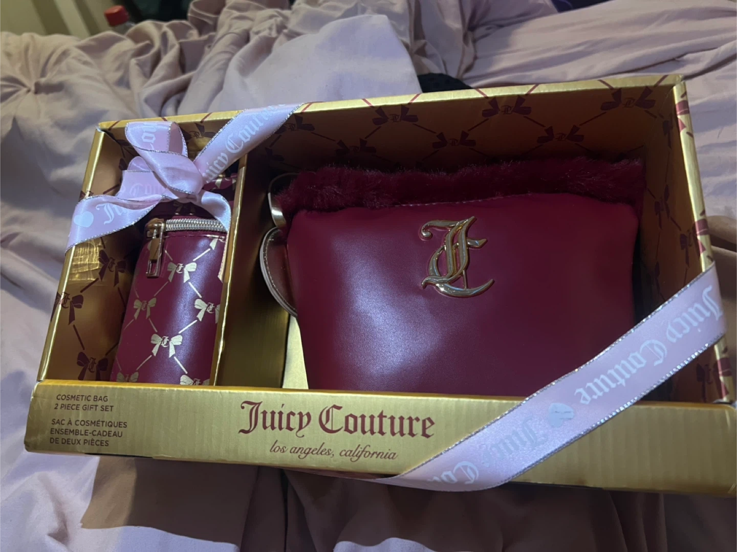 122Selling a brand new Juicy Couture 2-piece cosmetic bag gift set! It's a super cute set that includes a small cylindrical bag and a larger pouch, both in a matching burgundy colour with gold accents. The set comes in its original box, making it perfect for gifting or treating yourself