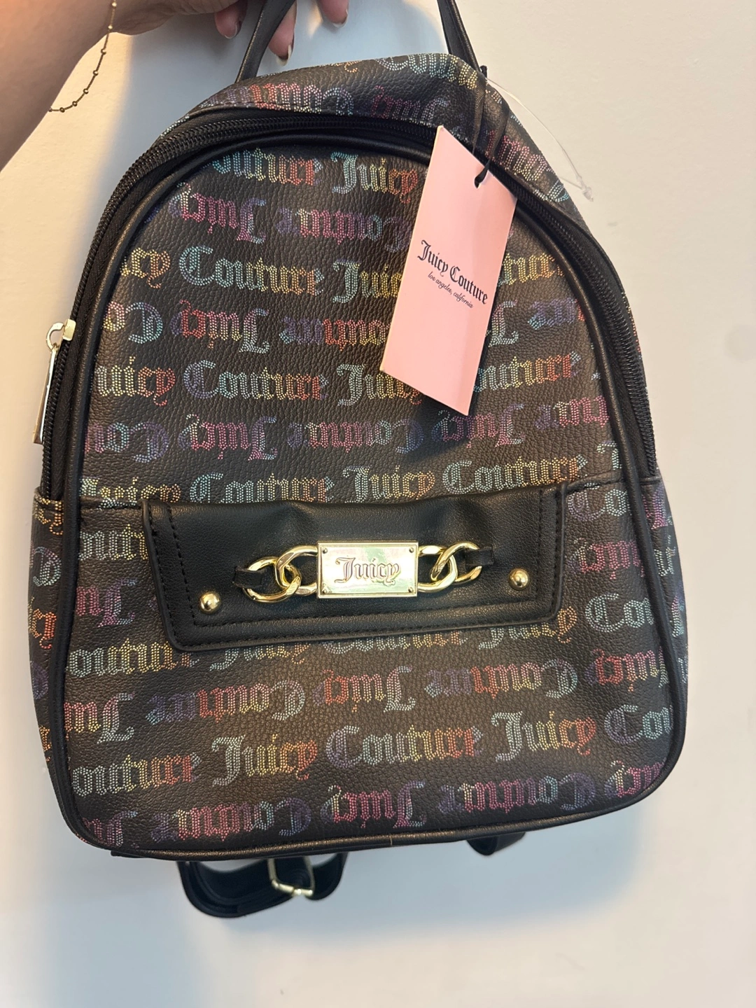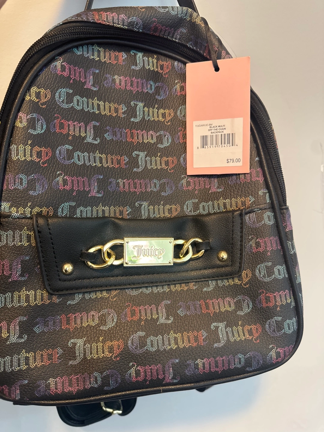 This Juicy Couture backpack features a black multi-coloured design. It has a front pocket with a gold chain detail and the Juicy logo. Originally bought for $79.00