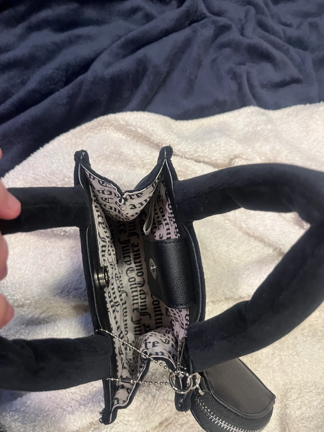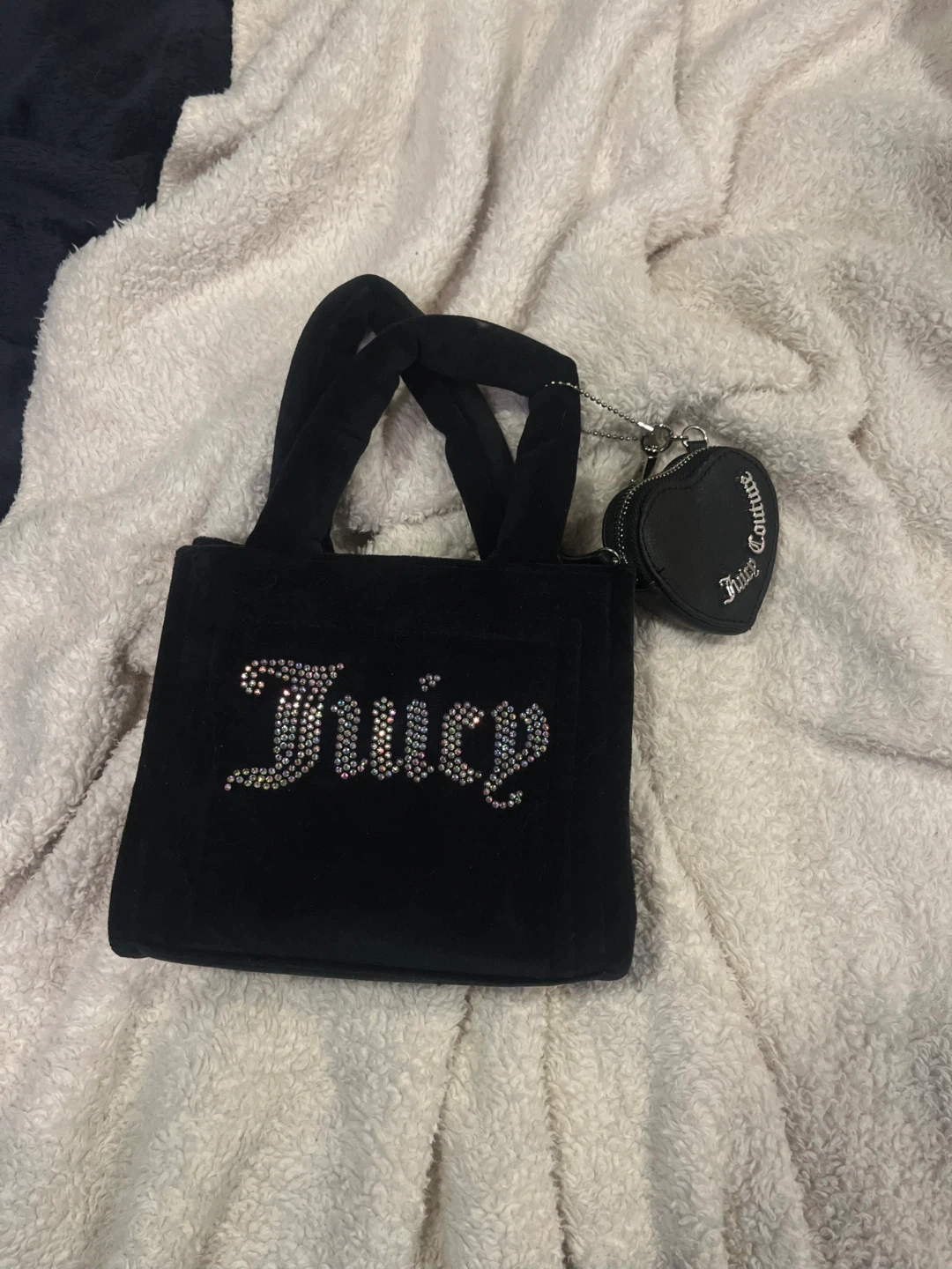76Selling a cute Juicy Couture mini tote bag in black! It comes with a matching heart-shaped coin purse. The inside lining has the Juicy Couture logo printed all over it. Perfect for adding a bit of sparkle to your outfit!