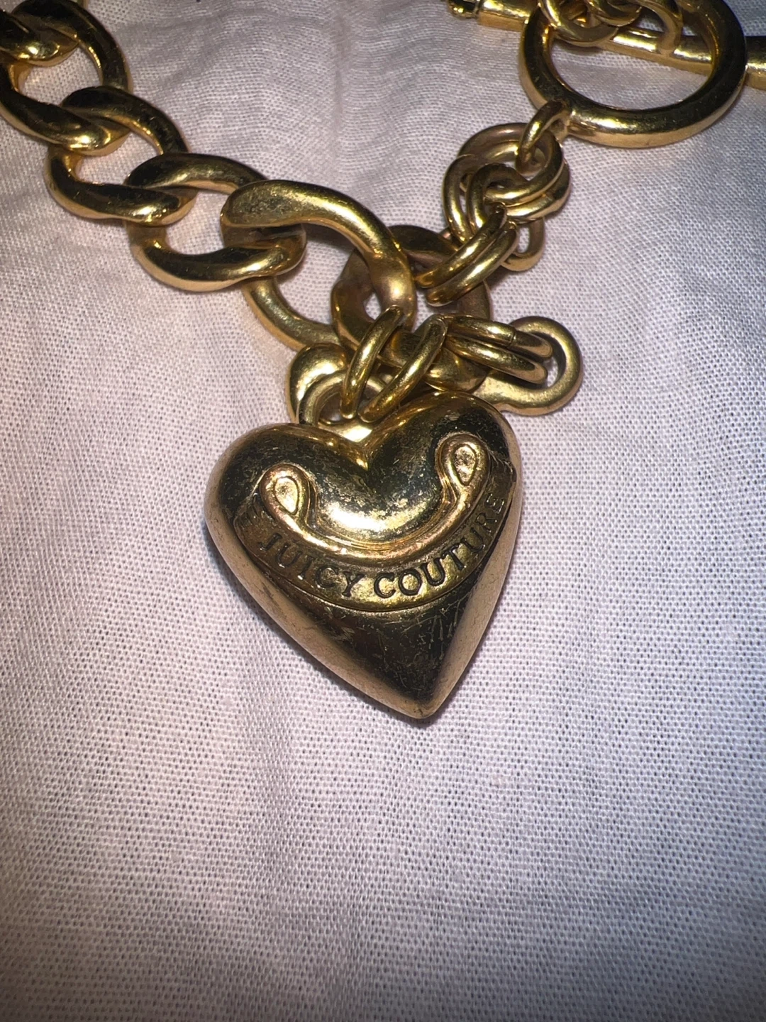 Selling a Juicy Couture gold-tone bracelet with a heart charm! It's a cute statement piece to add to your jewellery collection. The bracelet is in great condition and features the iconic Juicy Couture heart charm.