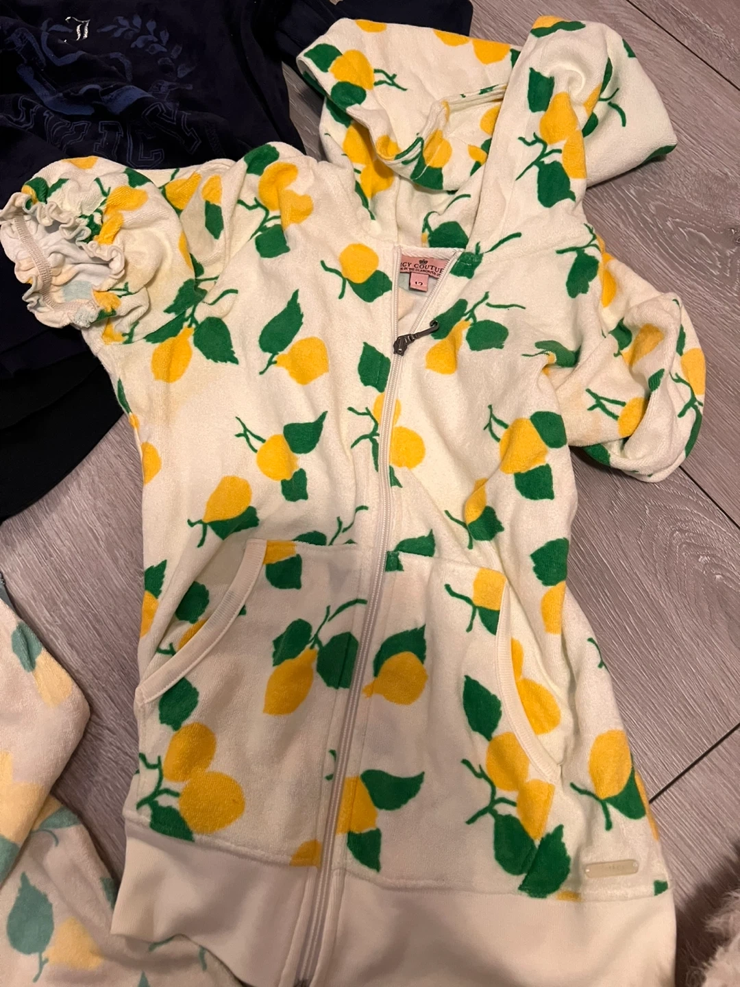 Selling a cute Juicy Couture zip-up hoodie with a fun lemon print! The size is youth 12 or adult size xs. It's in great condition and perfect for adding a pop of colour to your wardrobe. The material is soft and comfy, great for lounging around or casual outings