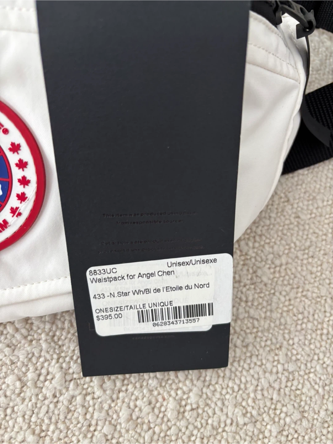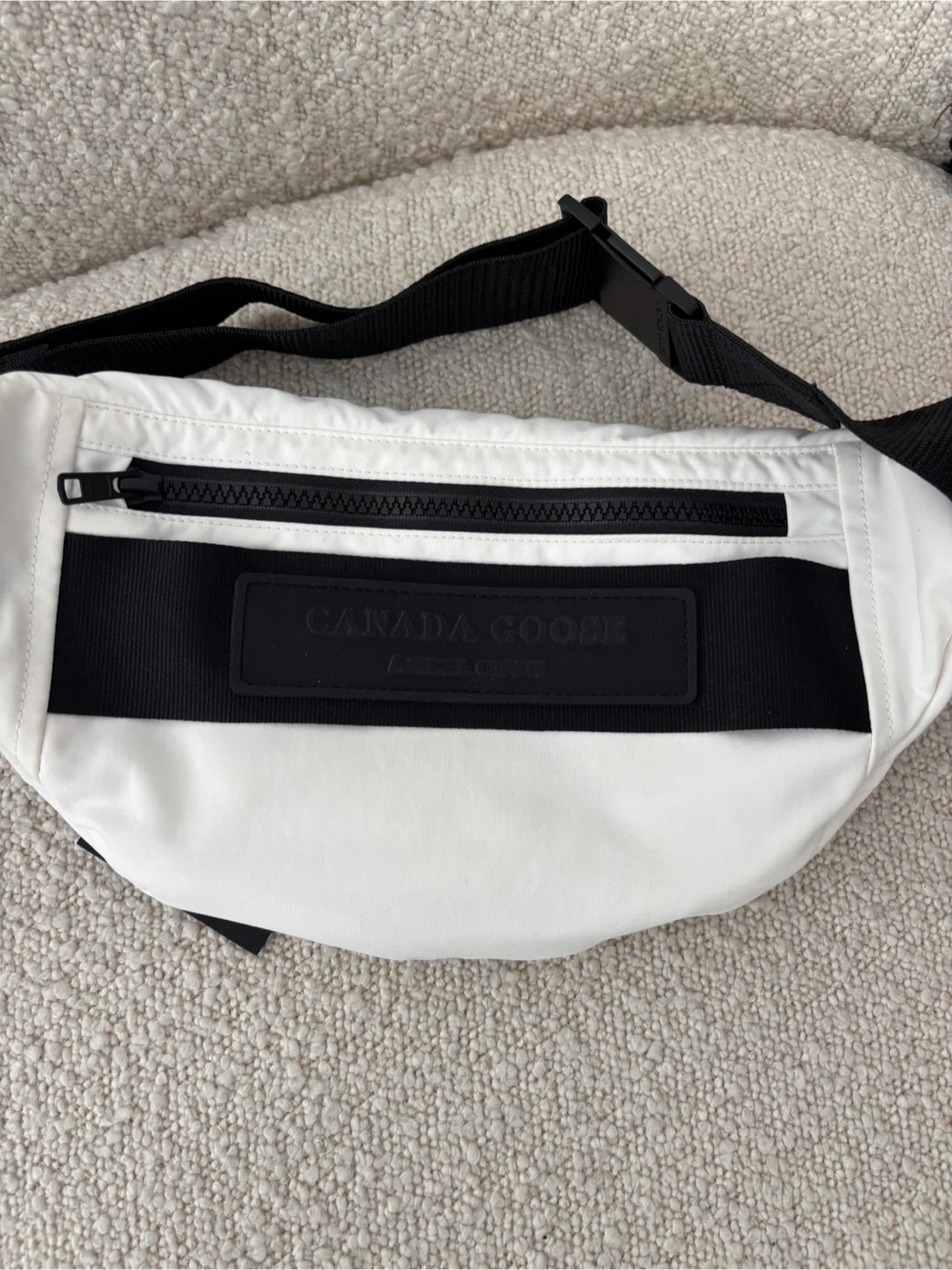 This Canada Goose waistpack is white with black stripe accents. It's a unisex, one-size fits all design. Perfect for carrying essentials on the go!