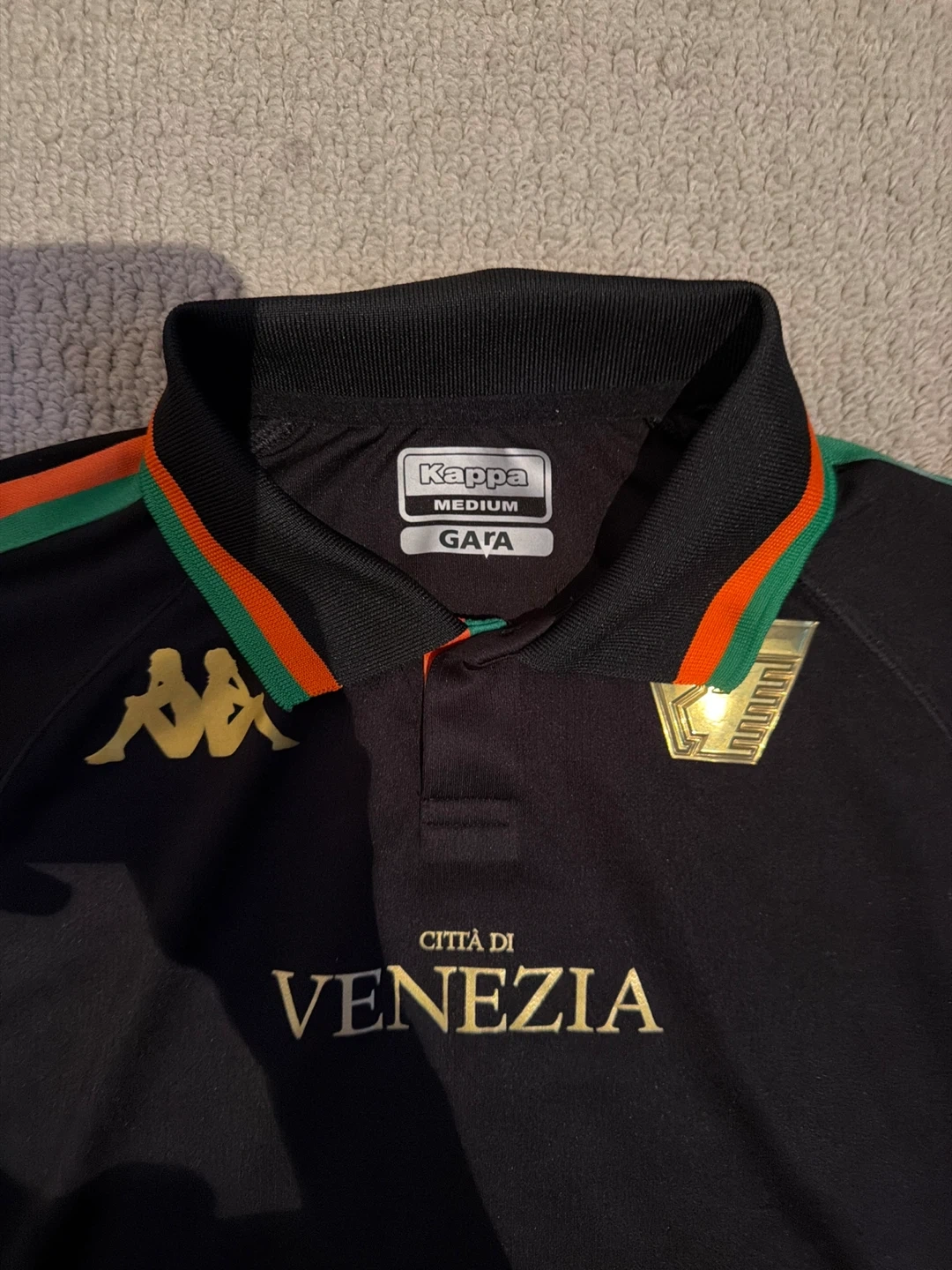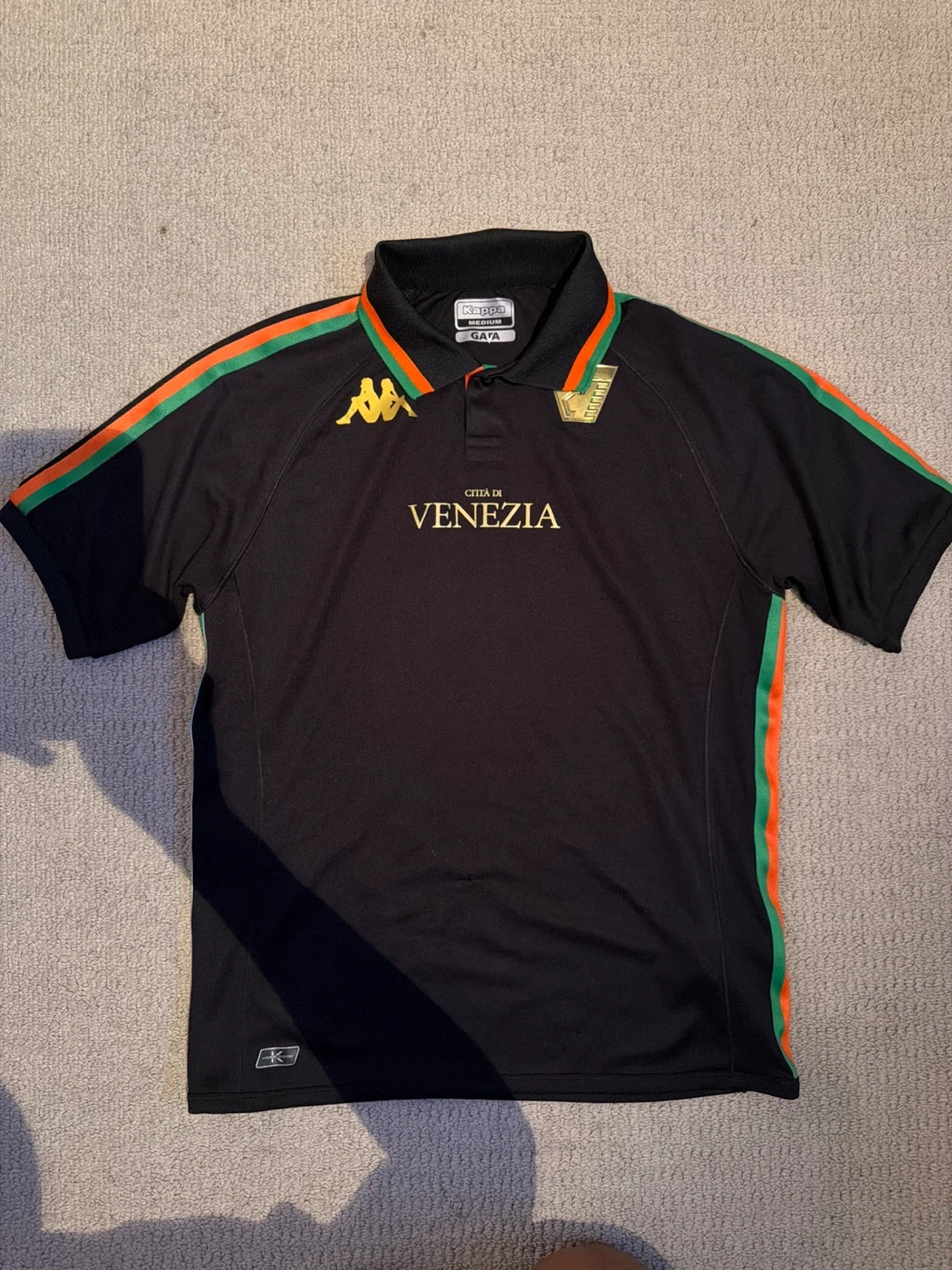This is a black Kappa "Città di Venezia" football polo shirt in size medium. It features the iconic Kappa logo and green and orange trim along the sleeves. Got it from the Kappa store couple of years ago, barely worn. In great condition.