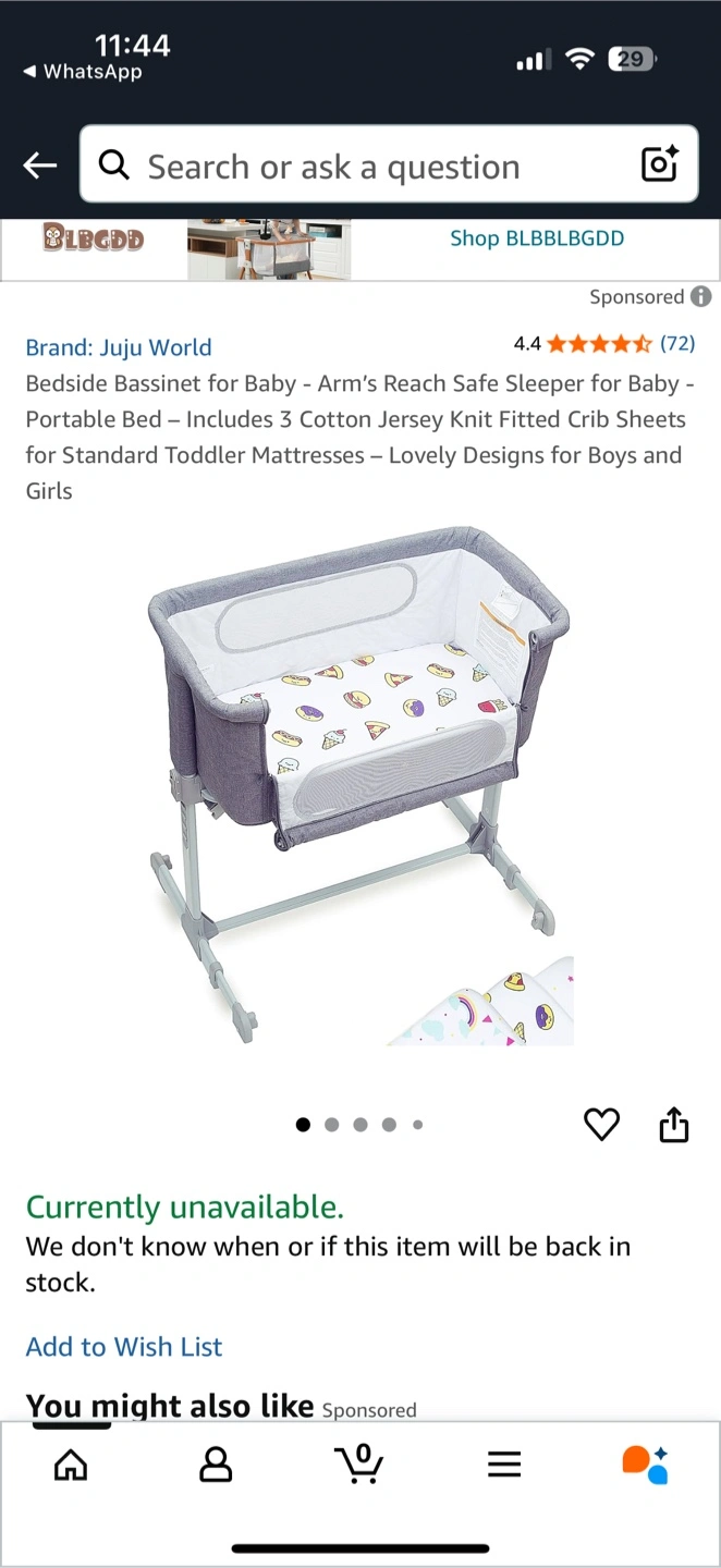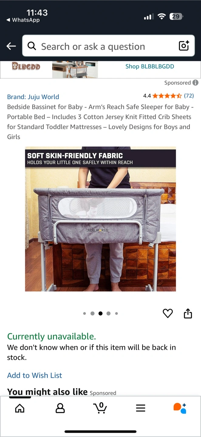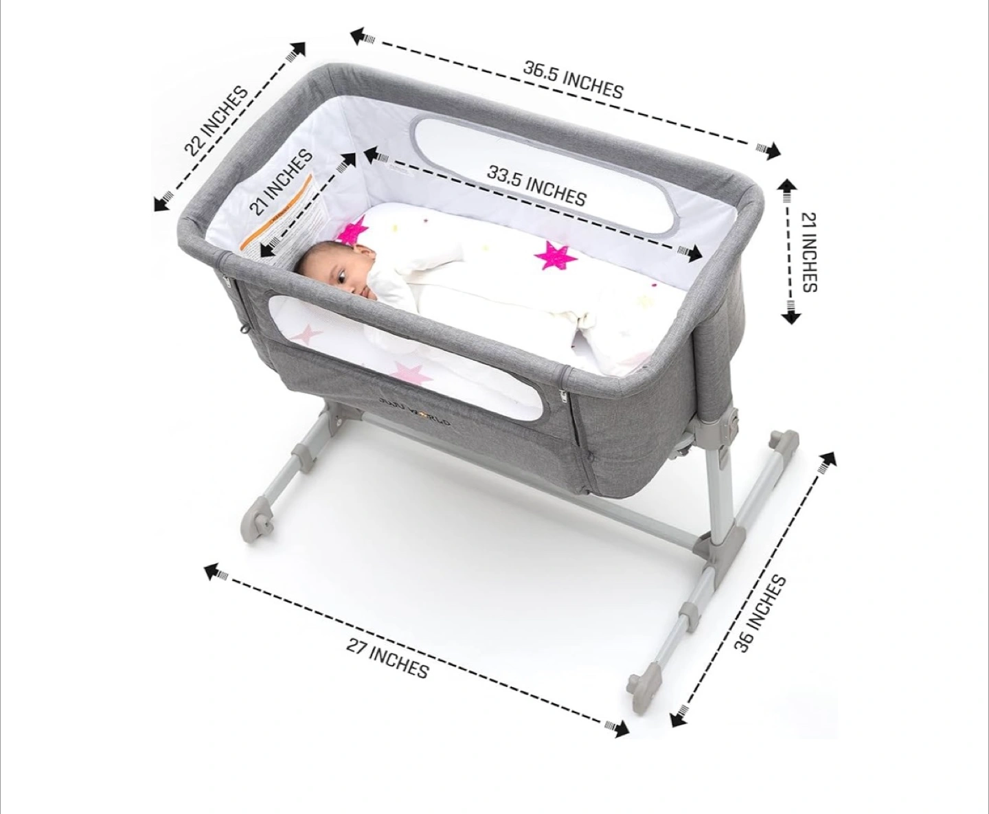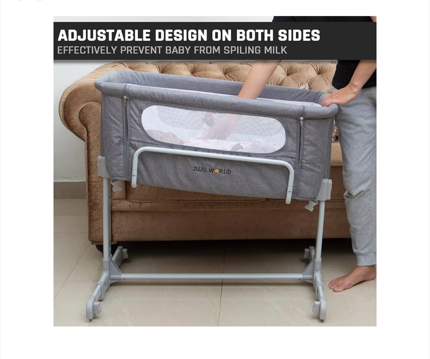 70This Juju World bedside bassinet is perfect for your little one! I bought it for $219 and it was used for just over three months It's designed to keep your baby within reach and features an adjustable design to prevent milk spillage. The soft, skin-friendly fabric ensures a comfortable sleep. It also folds for easy transport and storage, and the mattress cover can be easily removed and cleaned. Dimensions are approximately 36.5" x 22" x 36". I boght
