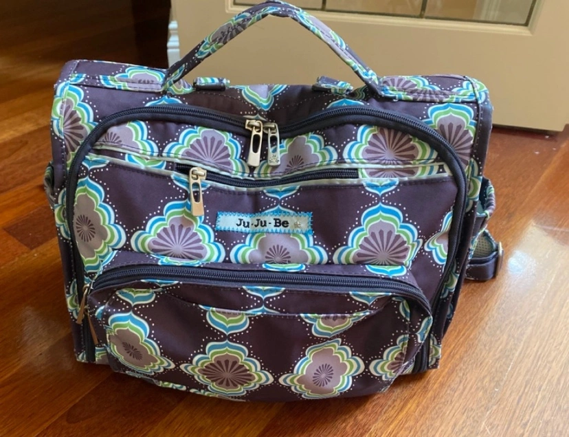 282Jujube diaper bag in a very good condition. Insulated interior and exterior bottle pocket. This convenient bag opening uses a horizontal layout which allows for quick access that stays open during diapering emergencies. Easy viewing helps you find whatever you need at a moment’s notice. Pick up only.