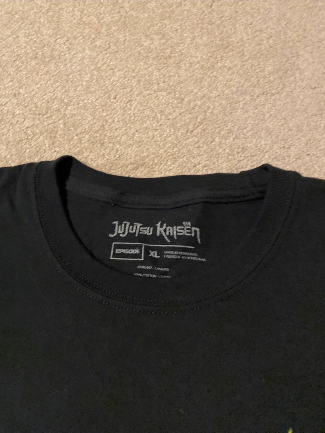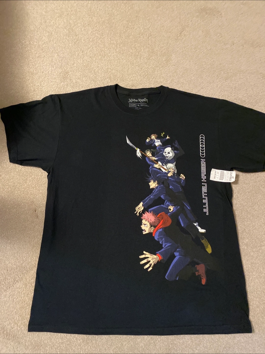 102Brand new. Black Jujutsu Kaisen graphic tee. Features anime characters. Size extra-large. Still with tags from Zumiez. 100% cotton.