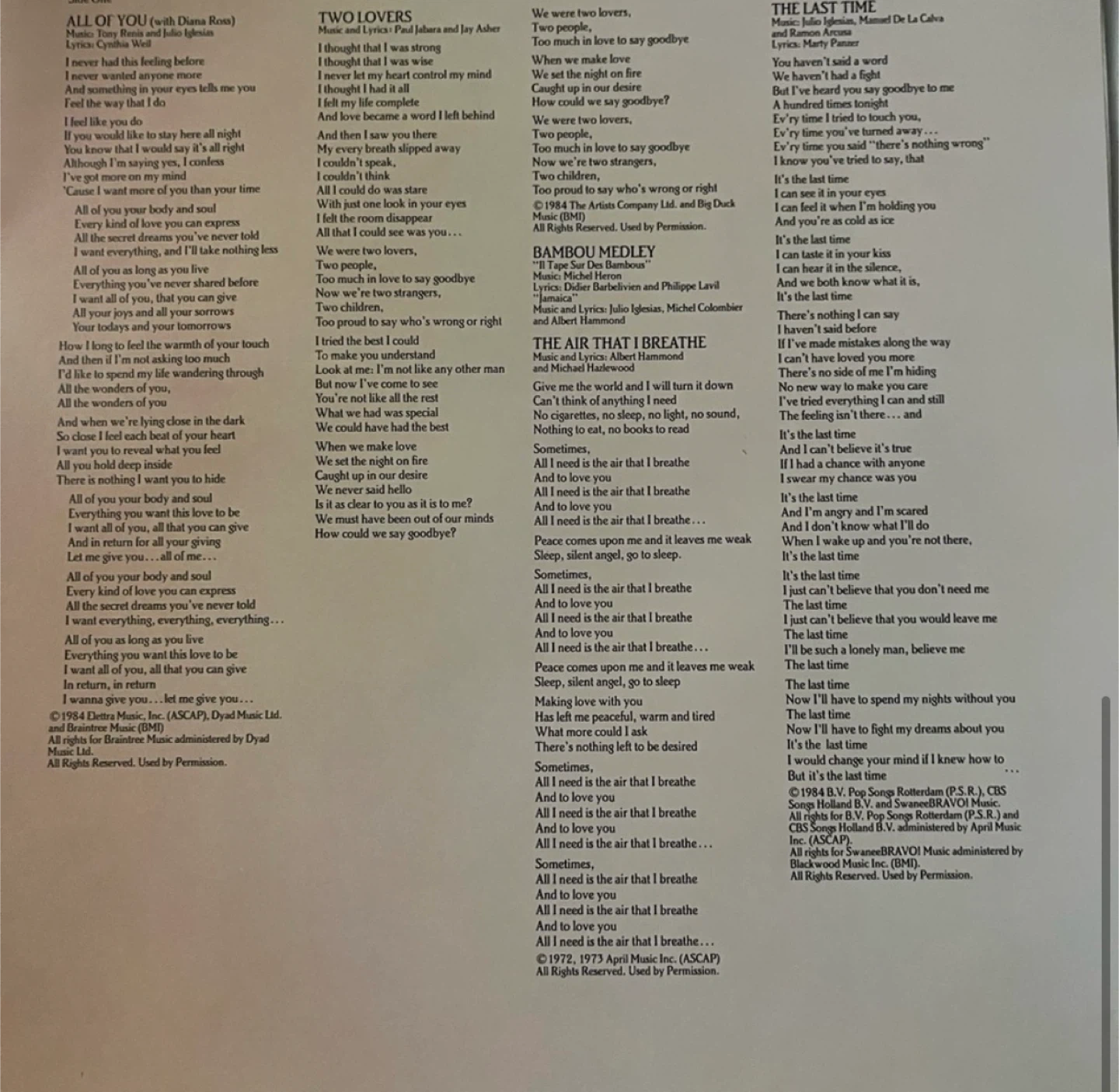 30Selling a Julio Iglesias vinyl album. Includes the smash duets "All Of You" with Dana Ross and "To All The Girls I've Loved Before" with Willie Nelson. Great condition and ready for a new home!