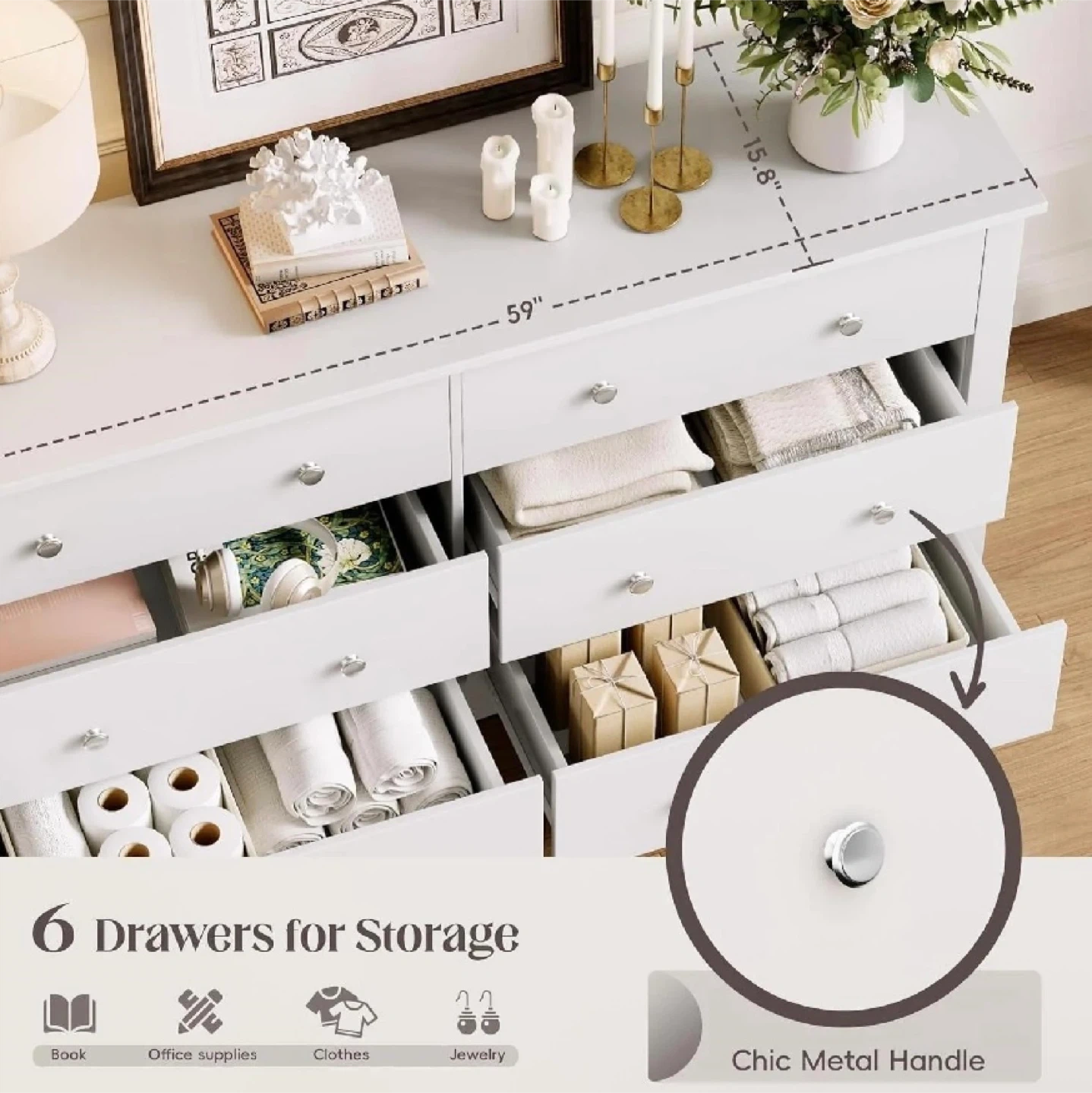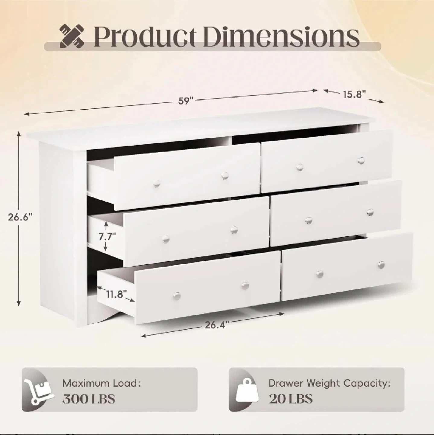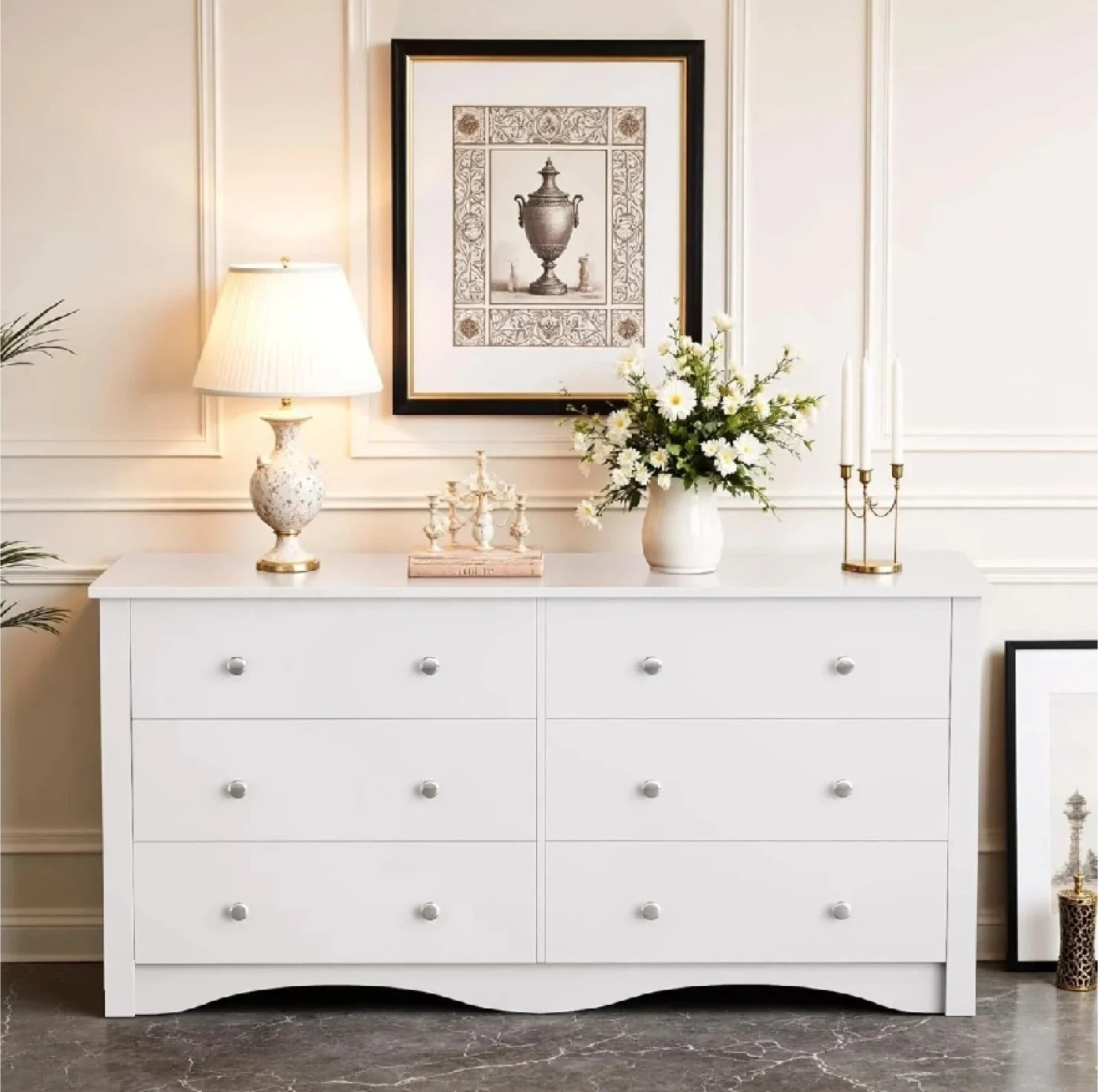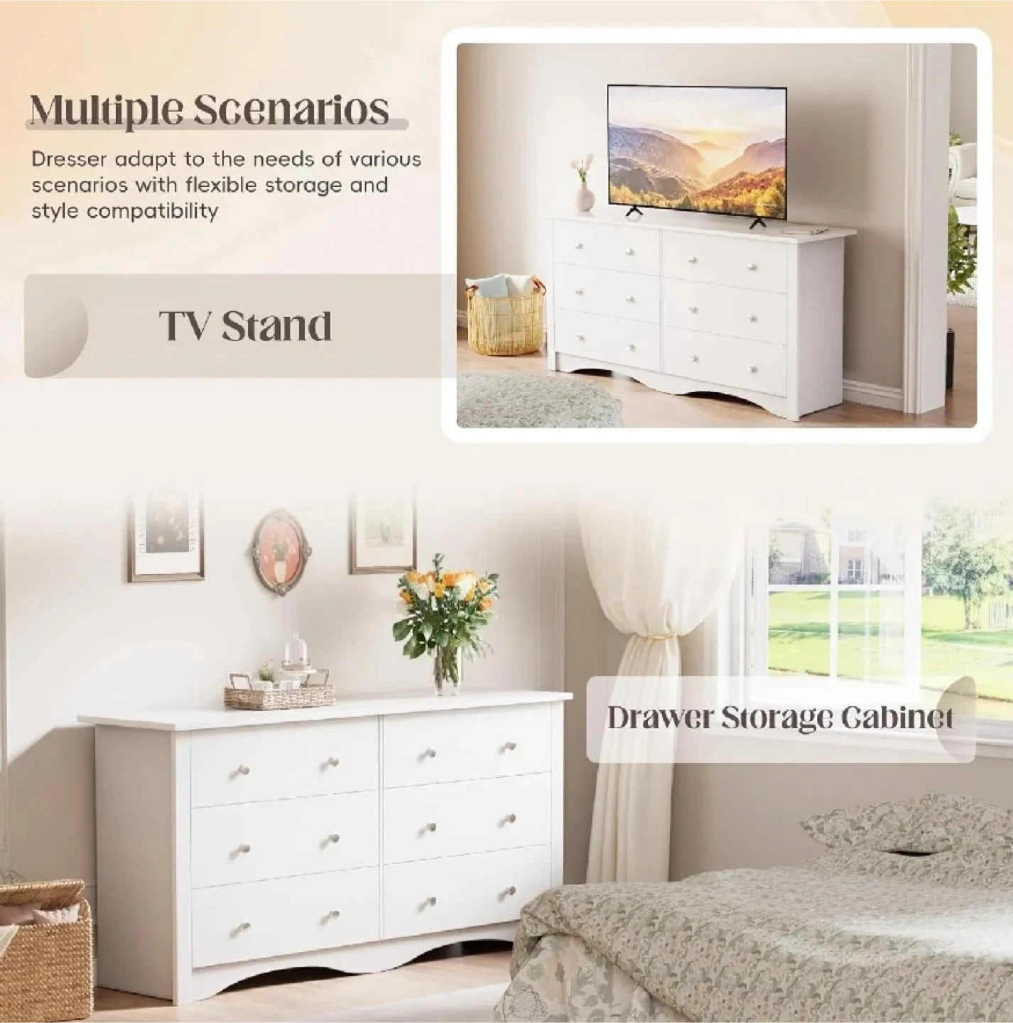 100This brand new in box JUMMICO 6-drawer dresser offers ample storage with its six spacious drawers, ideal for organizing clothes, accessories, or linens. The clean, white finish complements any bedroom decor, and the sturdy construction ensures lasting durability. Features: * Six drawers for maximum storage * Sleek metal handles * Can be used as a TV stand