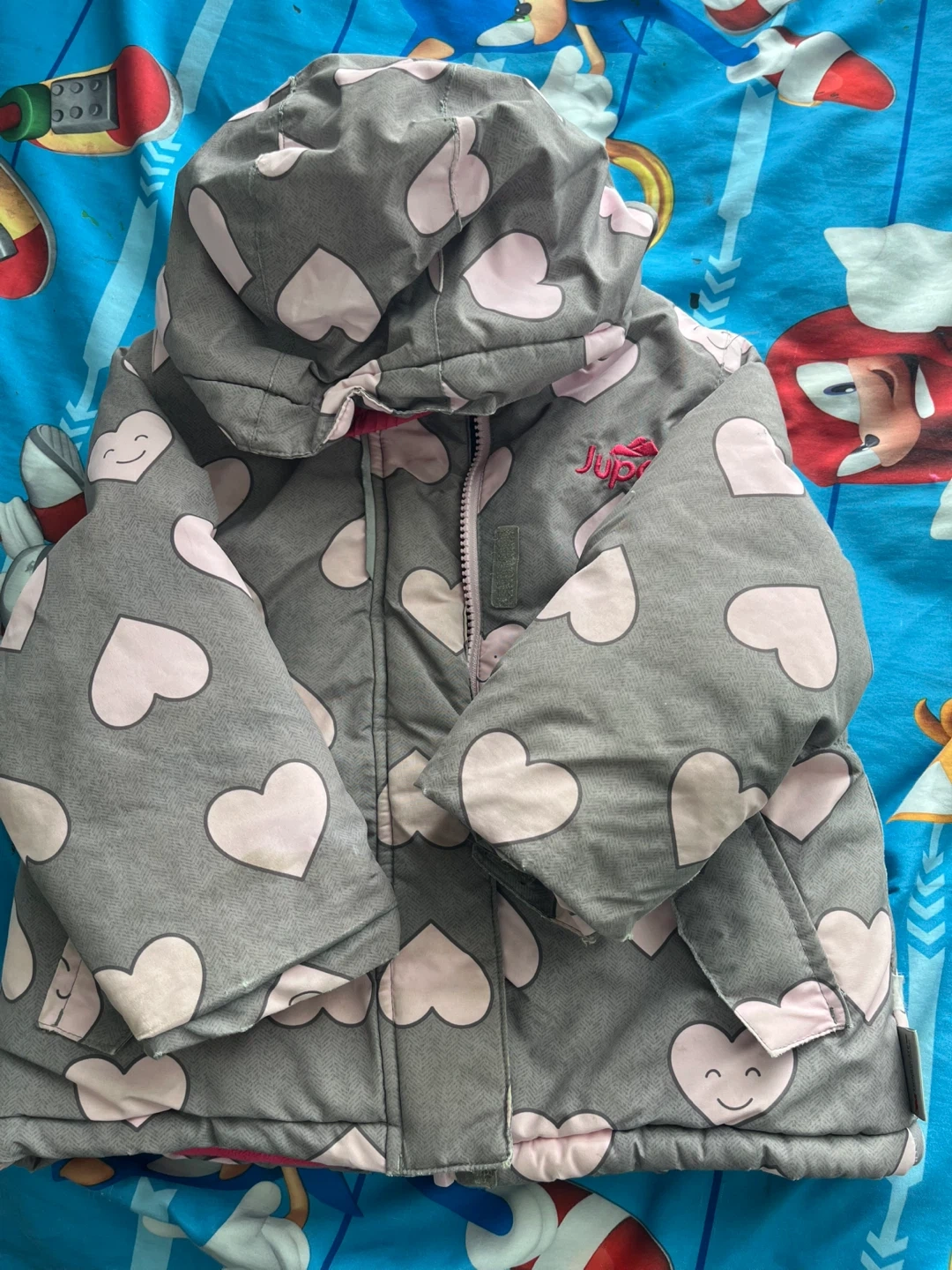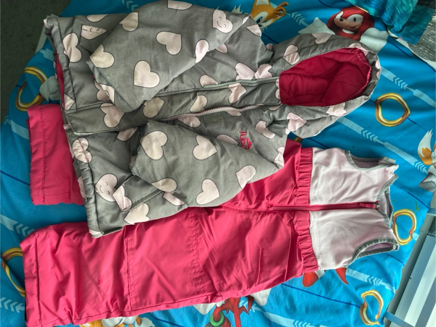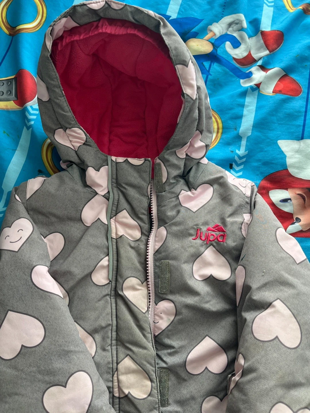 20Selling a Jupa snowsuit in size 2T! It features a cute grey and pink heart pattern on the jacket and solid pink snow pants. Perfect for keeping your little one warm and cozy this winter season