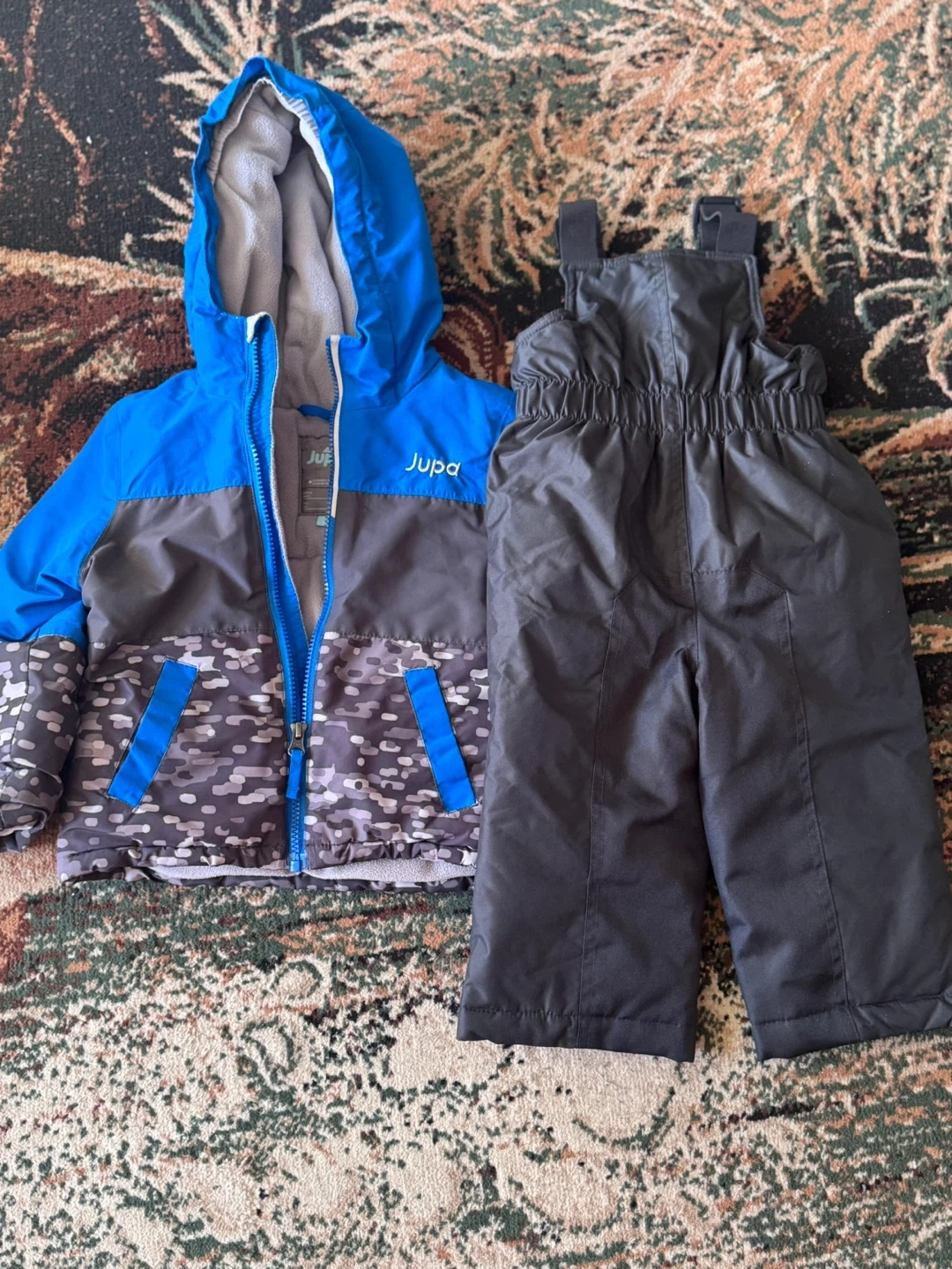 84Here's a Jupa snowsuit set that includes a jacket and pants. The jacket is blue, grey, and white, and the pants are black. Perfect for keeping your little one warm and dry this winter season!