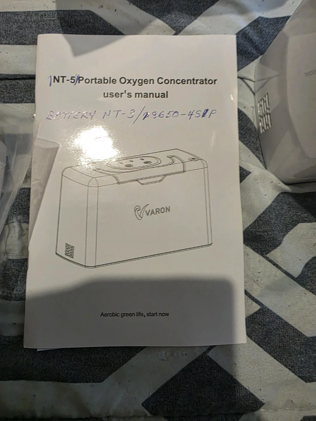 Varon portable oxygen concentrator NT-5. It's white and comes with a user's manual and power adapter. This concentrator is useful for individuals needing supplemental oxygen.