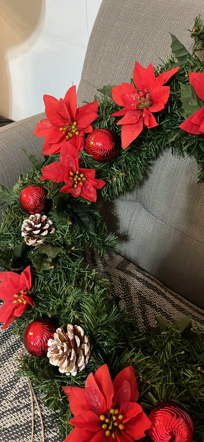 A festive Christmas wreath ready to brighten up your home for the holidays! It's decorated with red poinsettias, pine cones, and shiny red ornaments. The wreath measures approximately 20 inches in diameter.