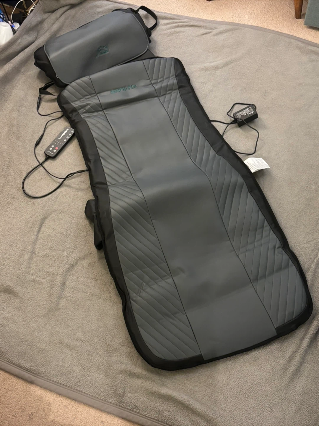 This SNAILAX massage mat offers a full body shiatsu massage experience. It features heat, adjustable intensity, and multiple modes for different areas like the shoulder, back, lumbar, and legs. It's perfect for unwinding after a long day! From a no pet and no smoking apartment.