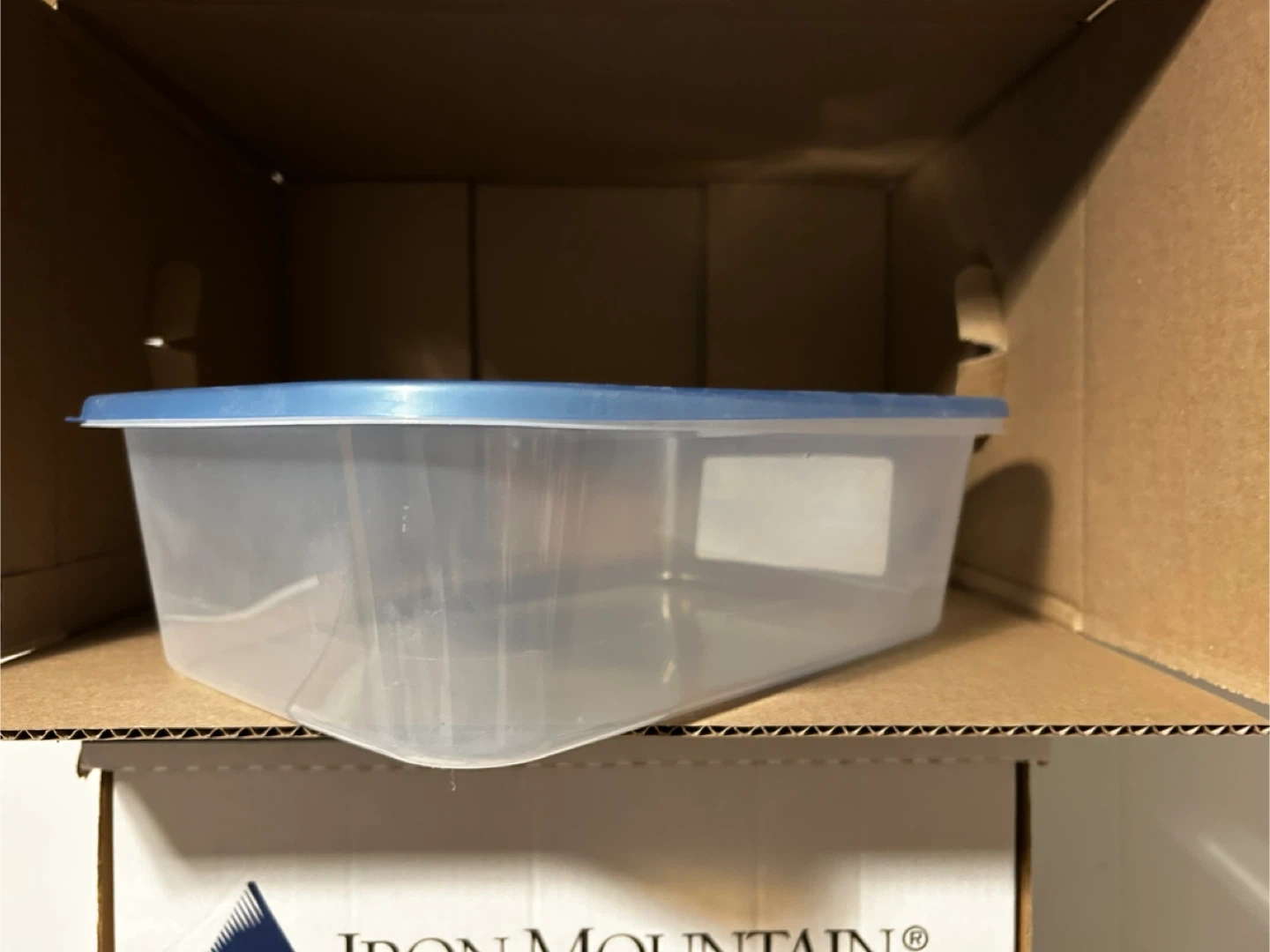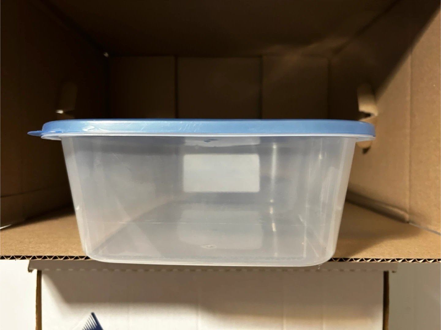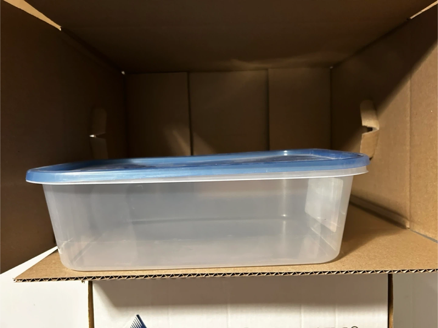 Plastic food storage container with a blue lid. It's made of clear plastic and is rectangular.
