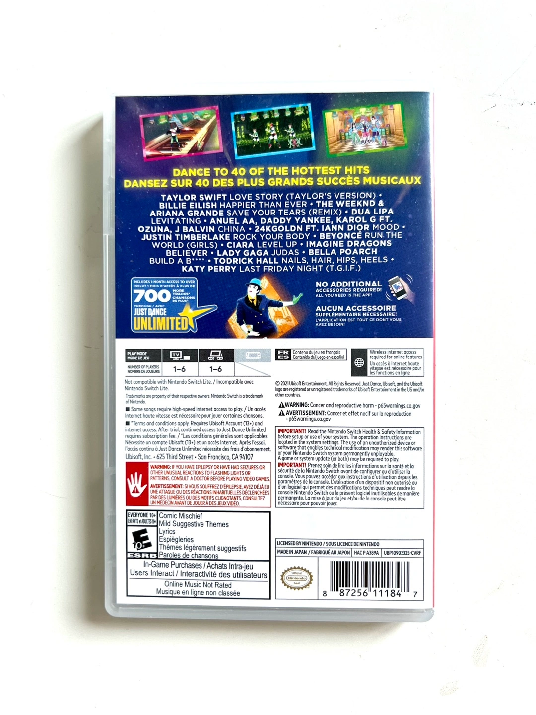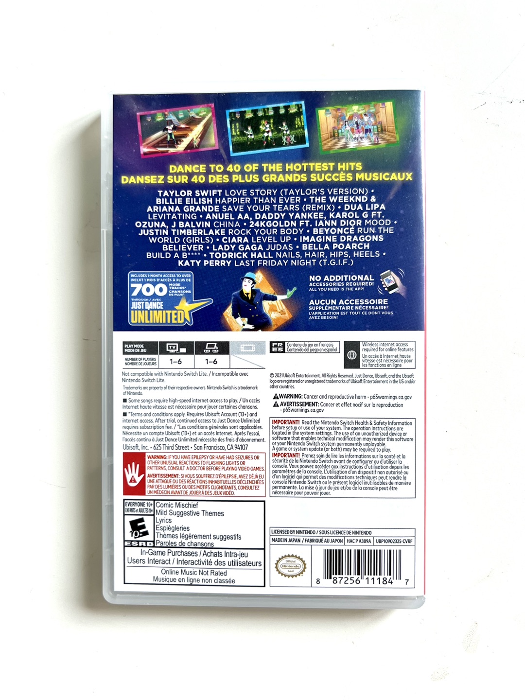 15Just Dance 2022 Switch Game. Perfect condition. Full of hit songs from Taylor Swift, Dua Lipa, Blackpink, Billie Eilish, Olivia Rodrigo, Beyoncé, Justin Timberlake, Imagine Dragons etc.