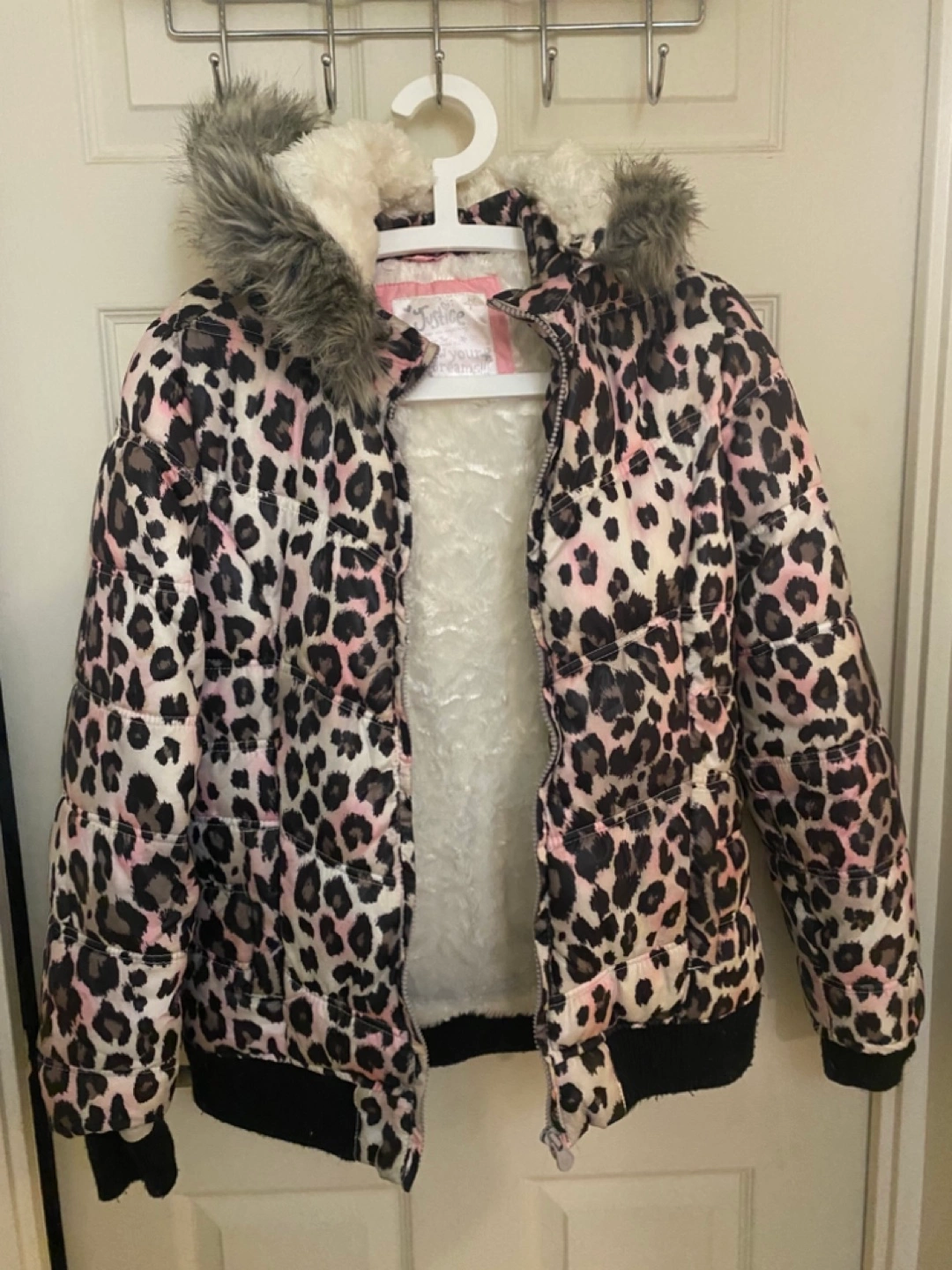 574Justice Pink and black leopard print jacket with a fur-lined hood. The jacket is fully lined with white faux fur. Size 16/18.