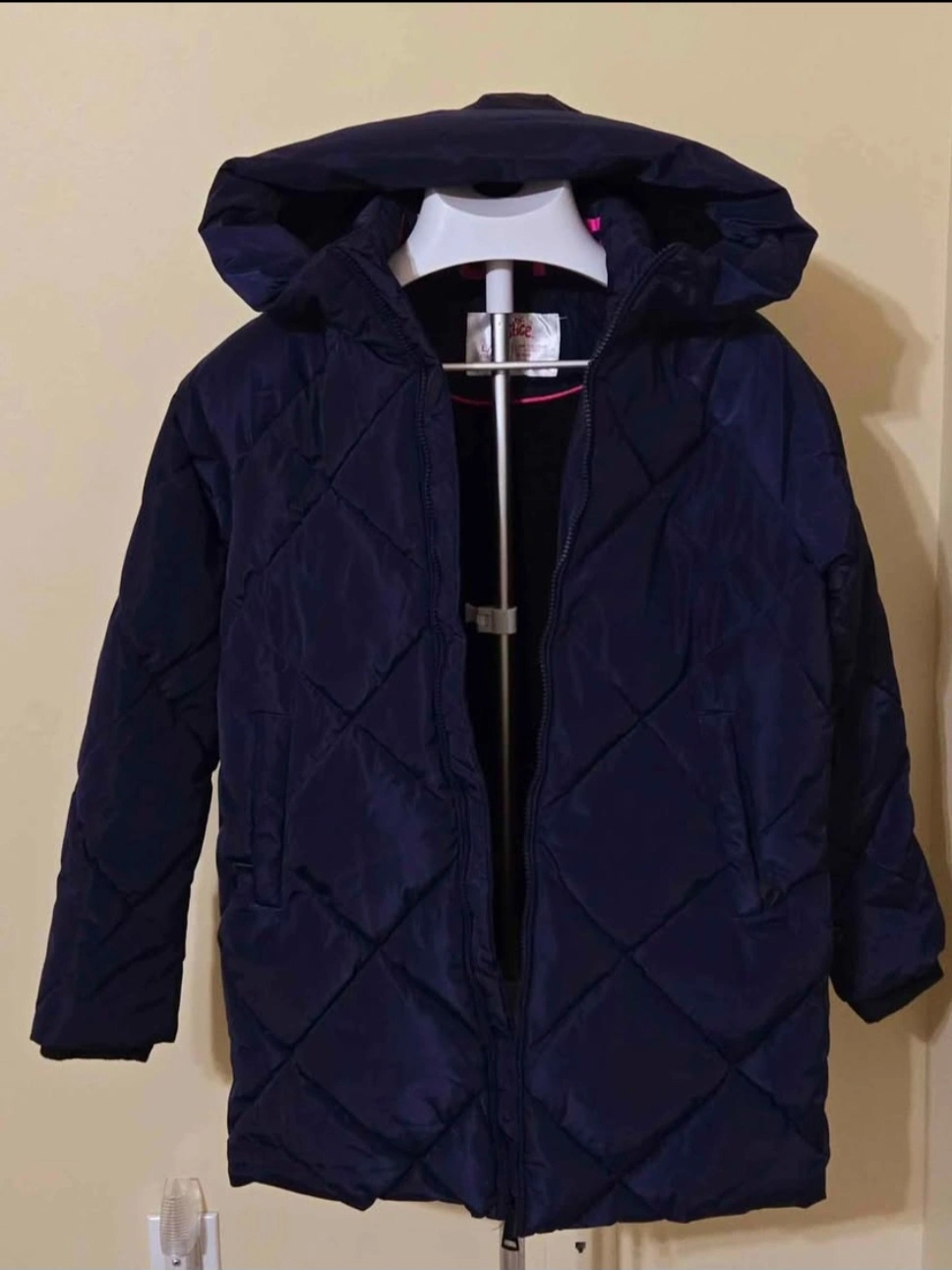 Justice girls' puffer jacket in a lovely navy blue color! It's never been worn and is perfect for keeping your little one warm and cozy. The jacket features a quilted design and a hood for extra protection from the elements. Age size: 10 to 12 years.