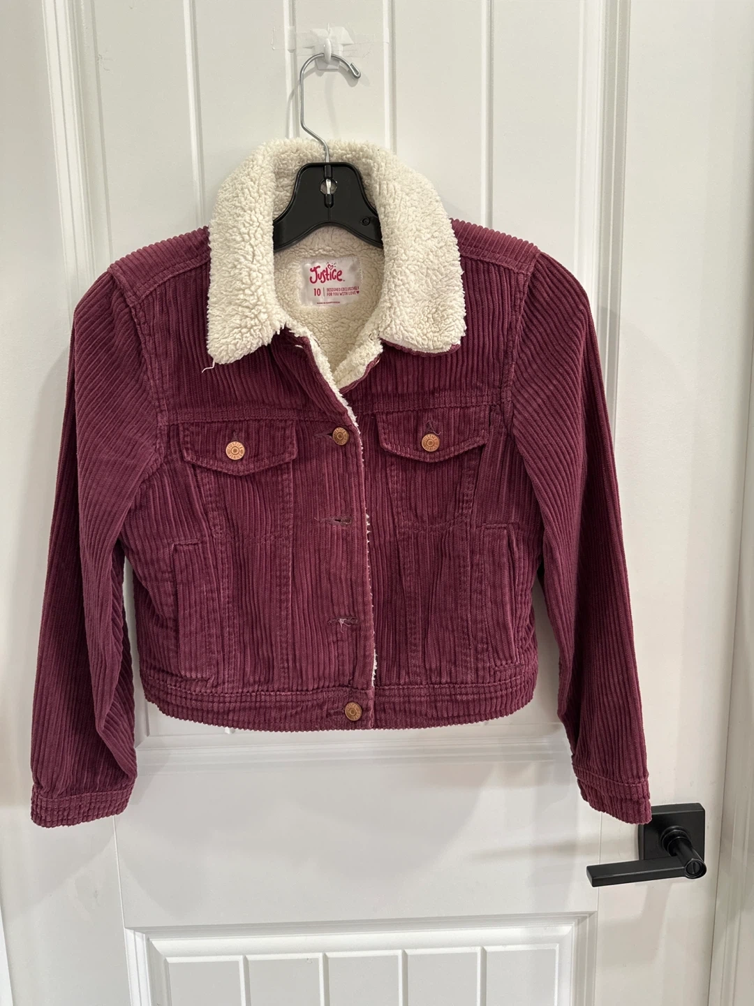 I have a Justice girls jacket for sale! It's a size 10 and features a fun purple tie-dye pattern. Also included is a Justice maroon corduroy jacket with a sherpa collar, also size 10. Both jackets are in great condition!