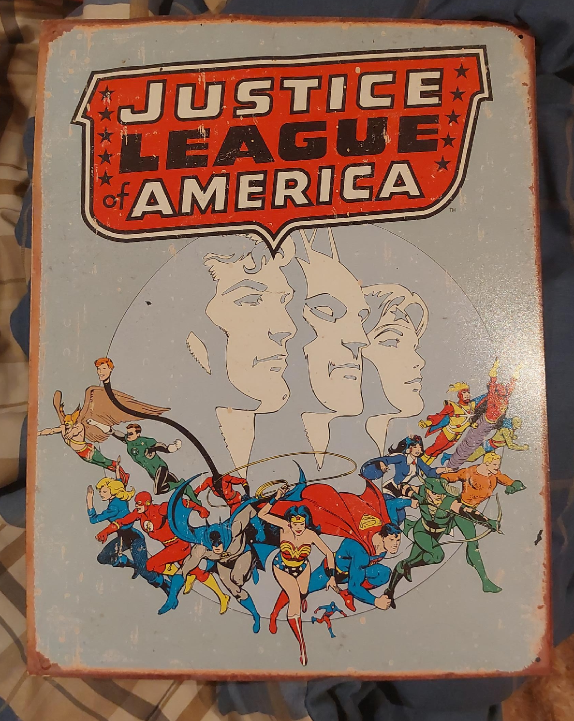 441Cool Justice League of America metal sign featuring Superman, Batman, Wonder Woman and more! It has a vintage look, perfect for a fan or collector