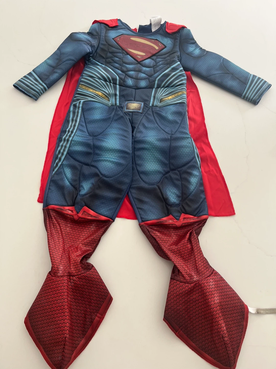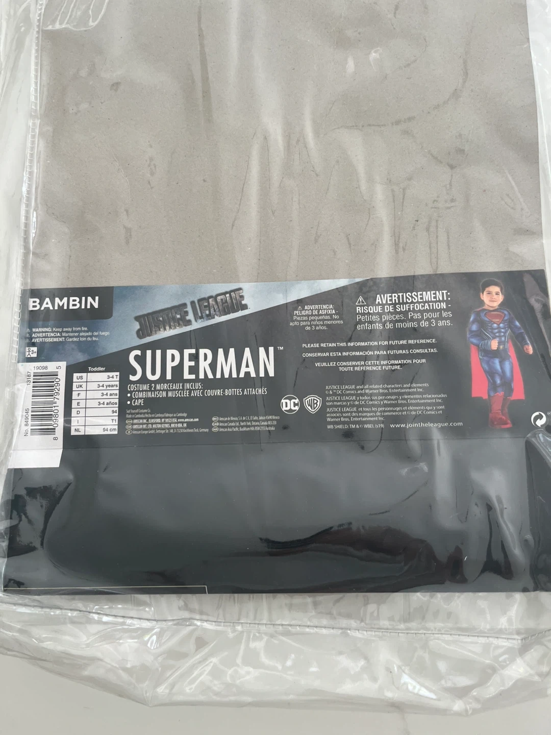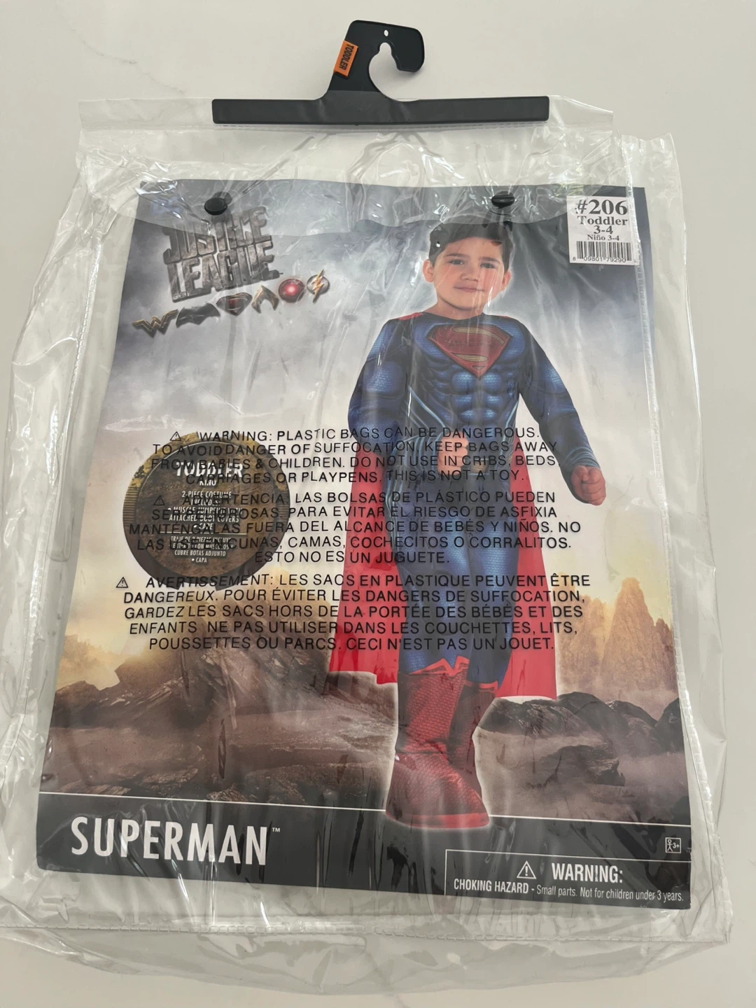 Selling a Justice League Superman costume for toddlers! It's a size 3-4T, perfect for little ones who love superheroes. The costume includes the jumpsuit and cape. Get your little one ready for some super adventures!