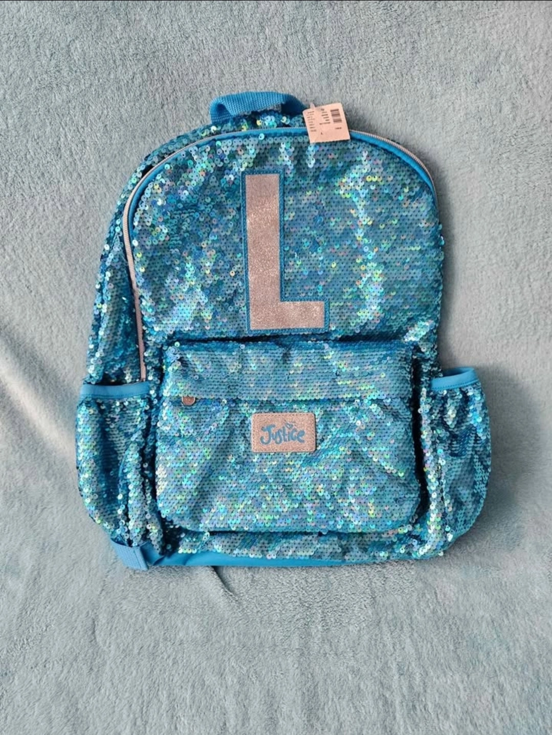 New original Justice backpack, brand new with tag. Letter L on the front, blue flippable sequins.