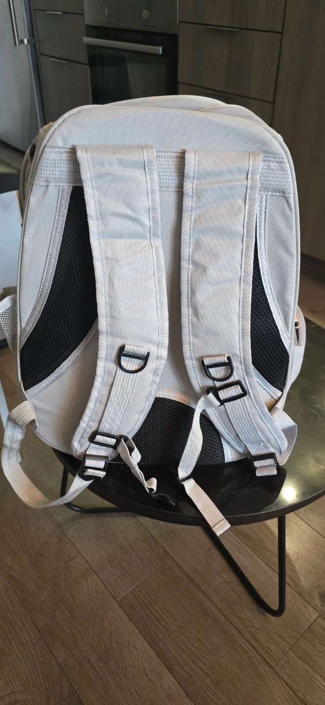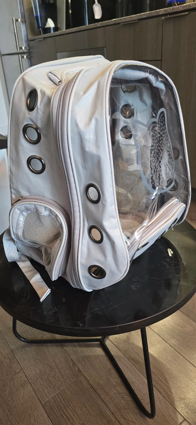 This light grey pet carrier backpack is perfect for taking your furry friend on the go! It features a clear dome so your pet can see out, along with mesh ventilation for comfort. It's a great way to travel with smaller pets.