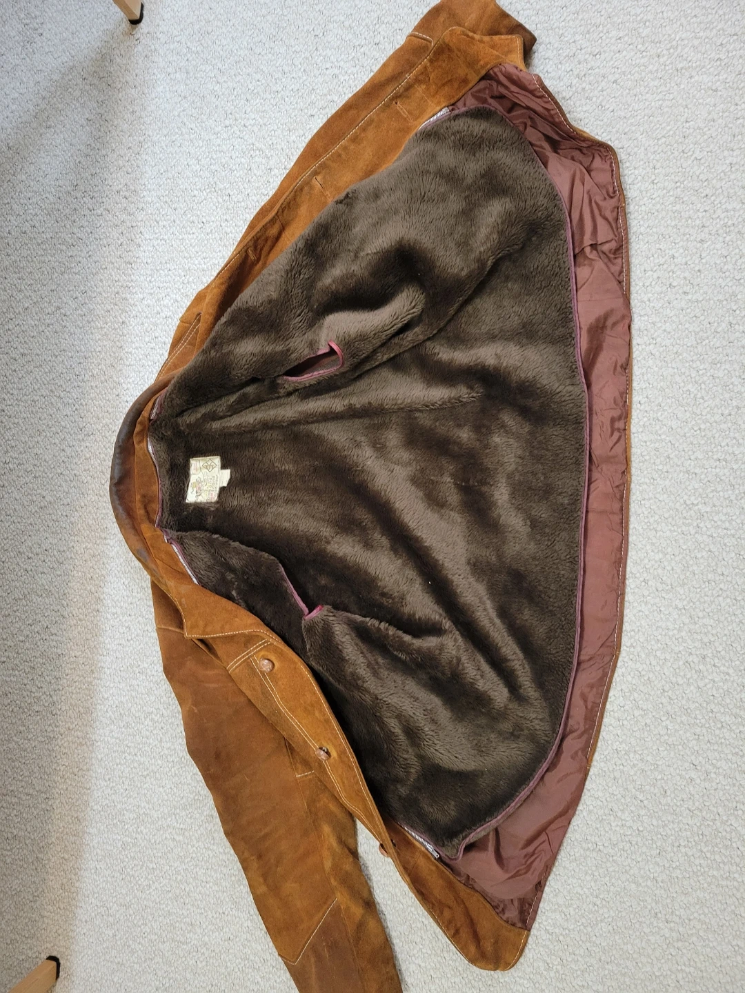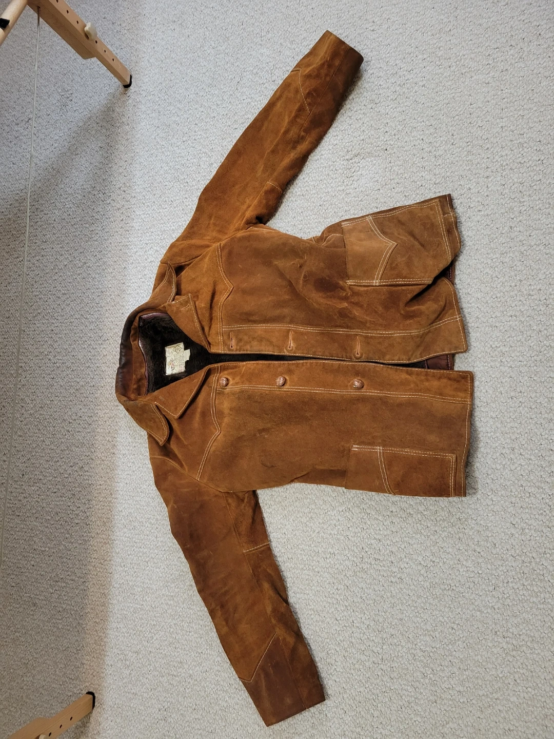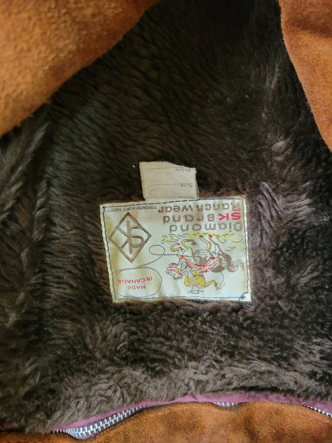 This SK Diamond Ranch Wear jacket is made with a soft suede outer and a warm sherpa lining. It features a button-up front and a zip out liner. A classic piece for cooler weather! Truly a vintage piece of clothing.