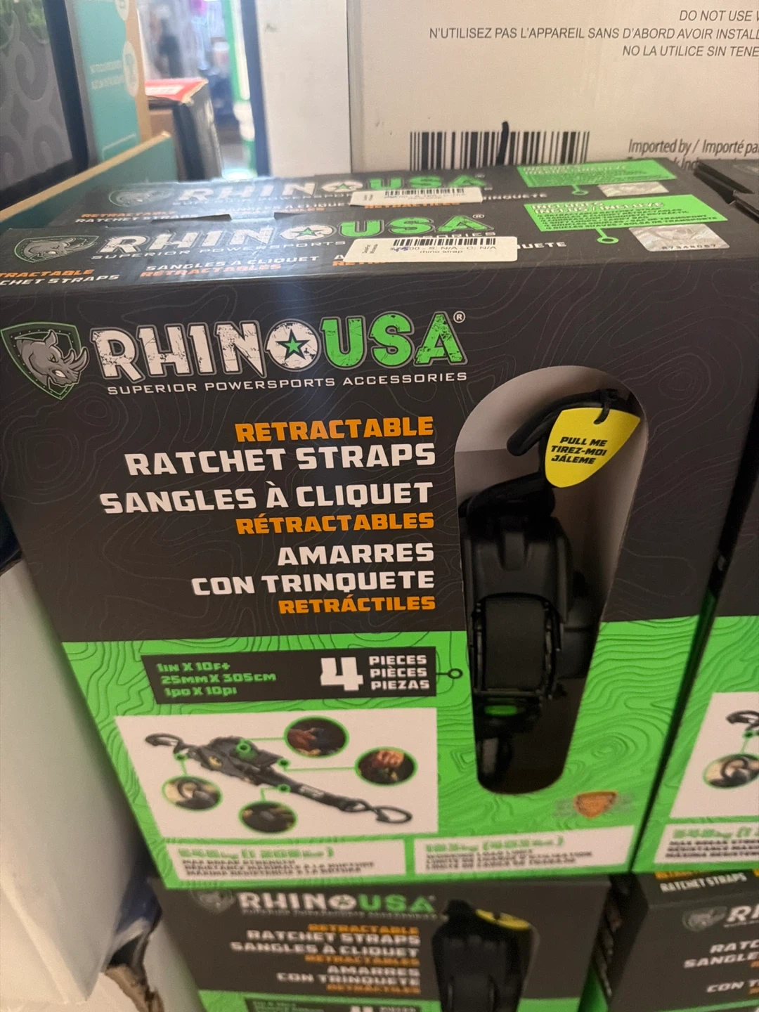 These Rhino USA retractable ratchet straps are for superior powersports accessories. Each strap measures 10ft x 1in (305cm x 25mm) and comes with 4 pieces per pack. They offer a 1200 lb. working load limit and a 3600 lb. break strength.