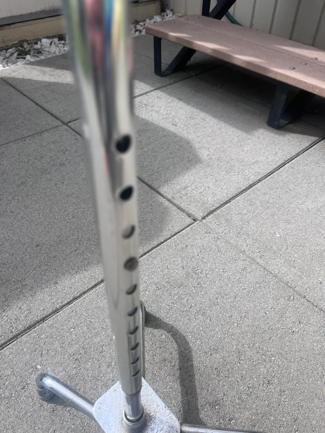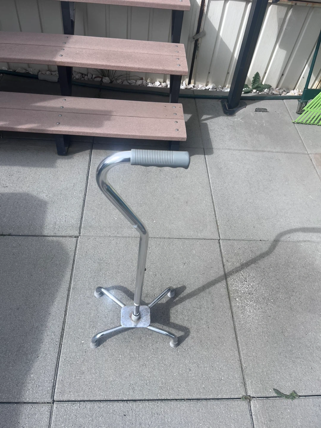 This is an adjustable quadcane walking cane with a four-pronged base for stability. It features a comfortable ribbed grip and a height-adjustable shaft. The shaft has multiple pinholes for customized height settings. This cane offers support for walking and balance.
