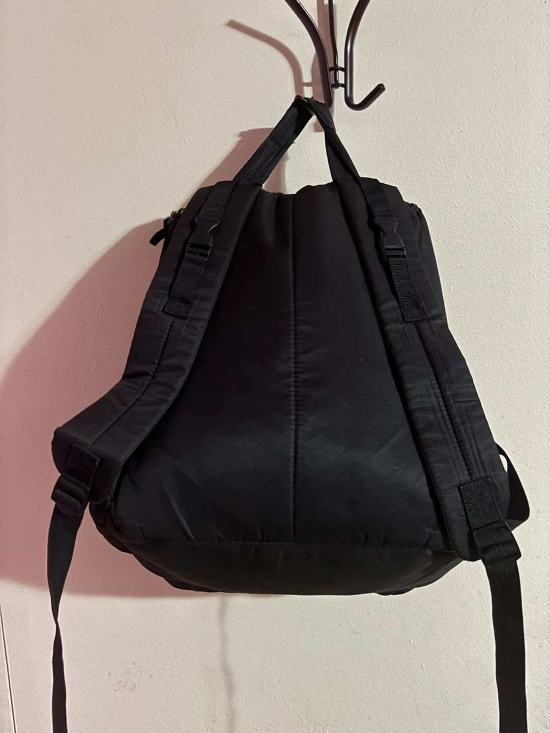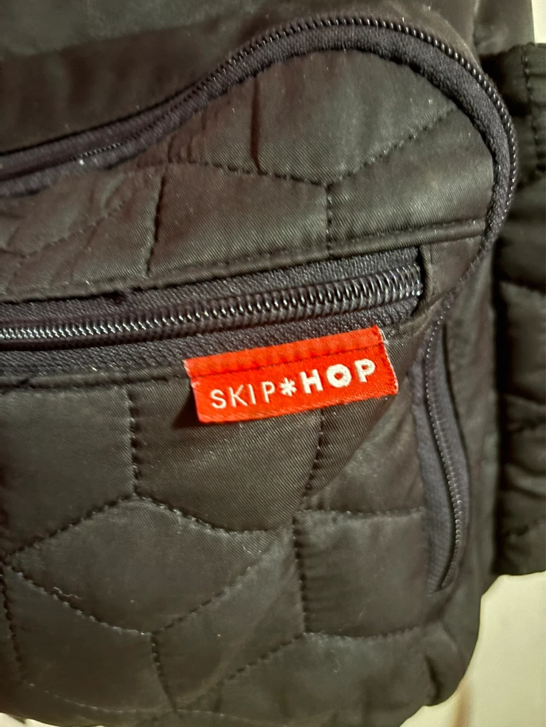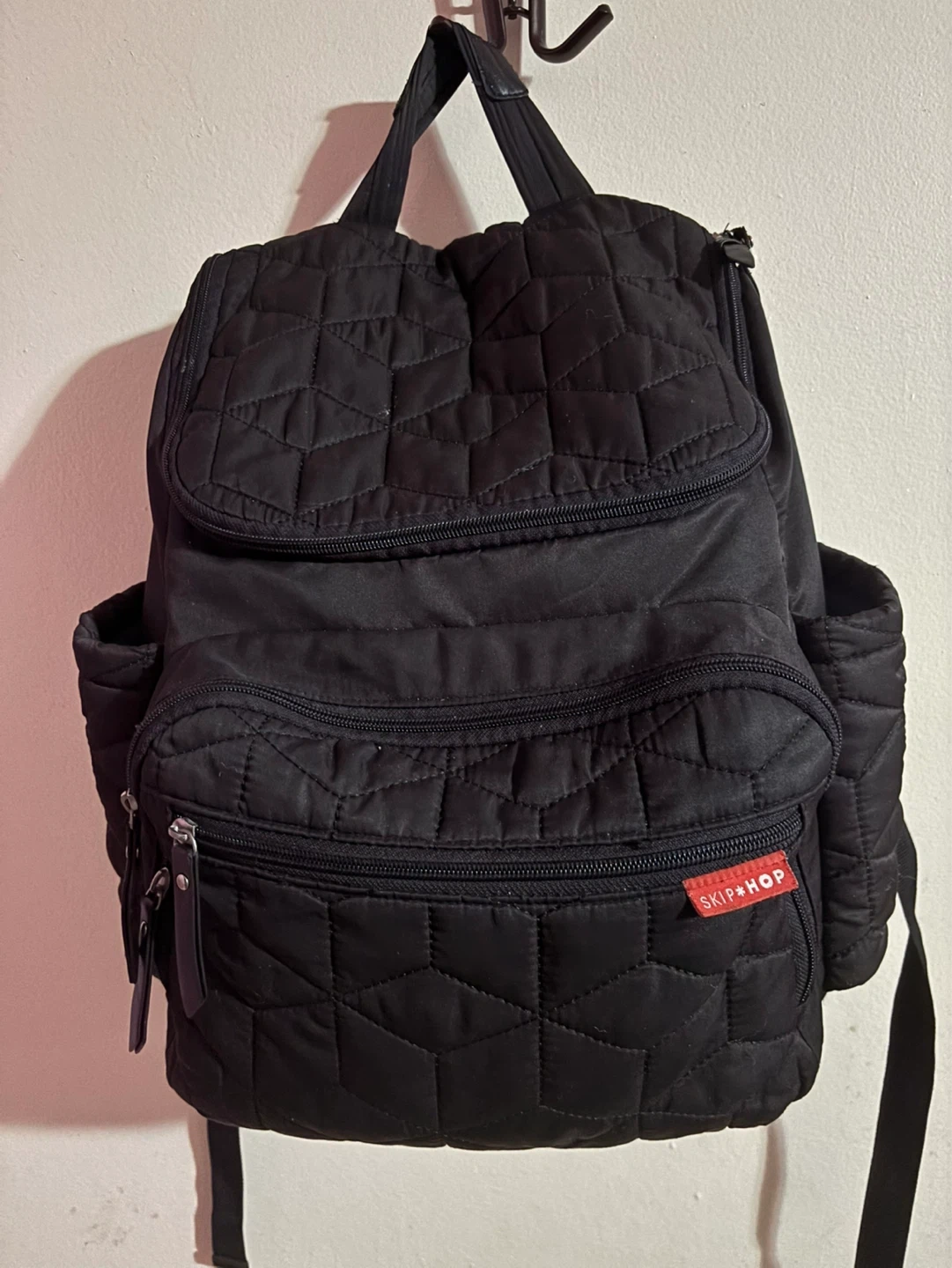 This black quilted backpack is from Skip Hop. It features multiple zippered pockets and side pouches. It's a stylish and functional option for everyday use.