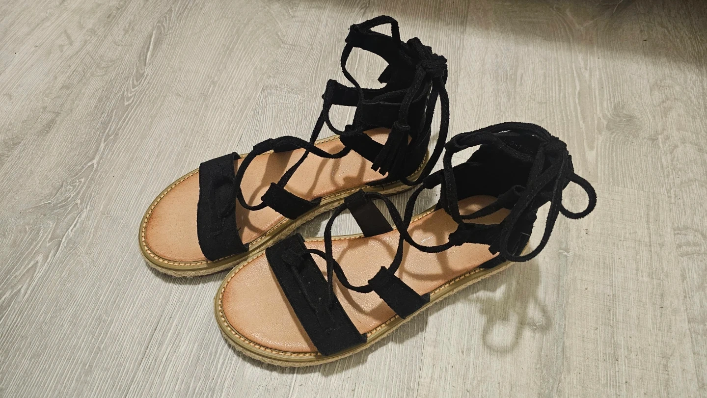 Stylish black suede gladiator sandals with lace-up detailing and decorative tassels. These flat sandals feature a comfortable espadrille-style sole. Perfect for adding a bohemian touch to any summer outfit!