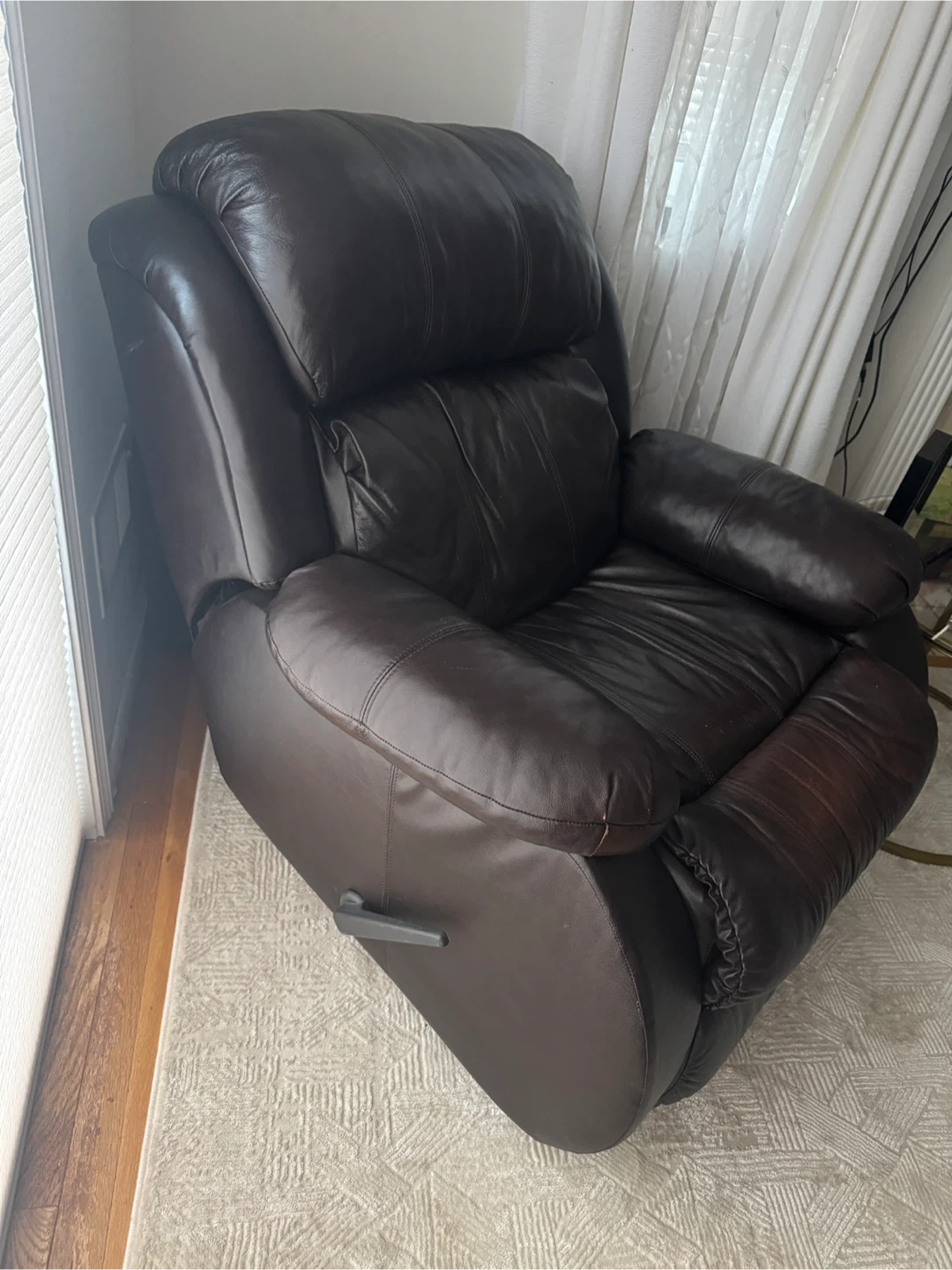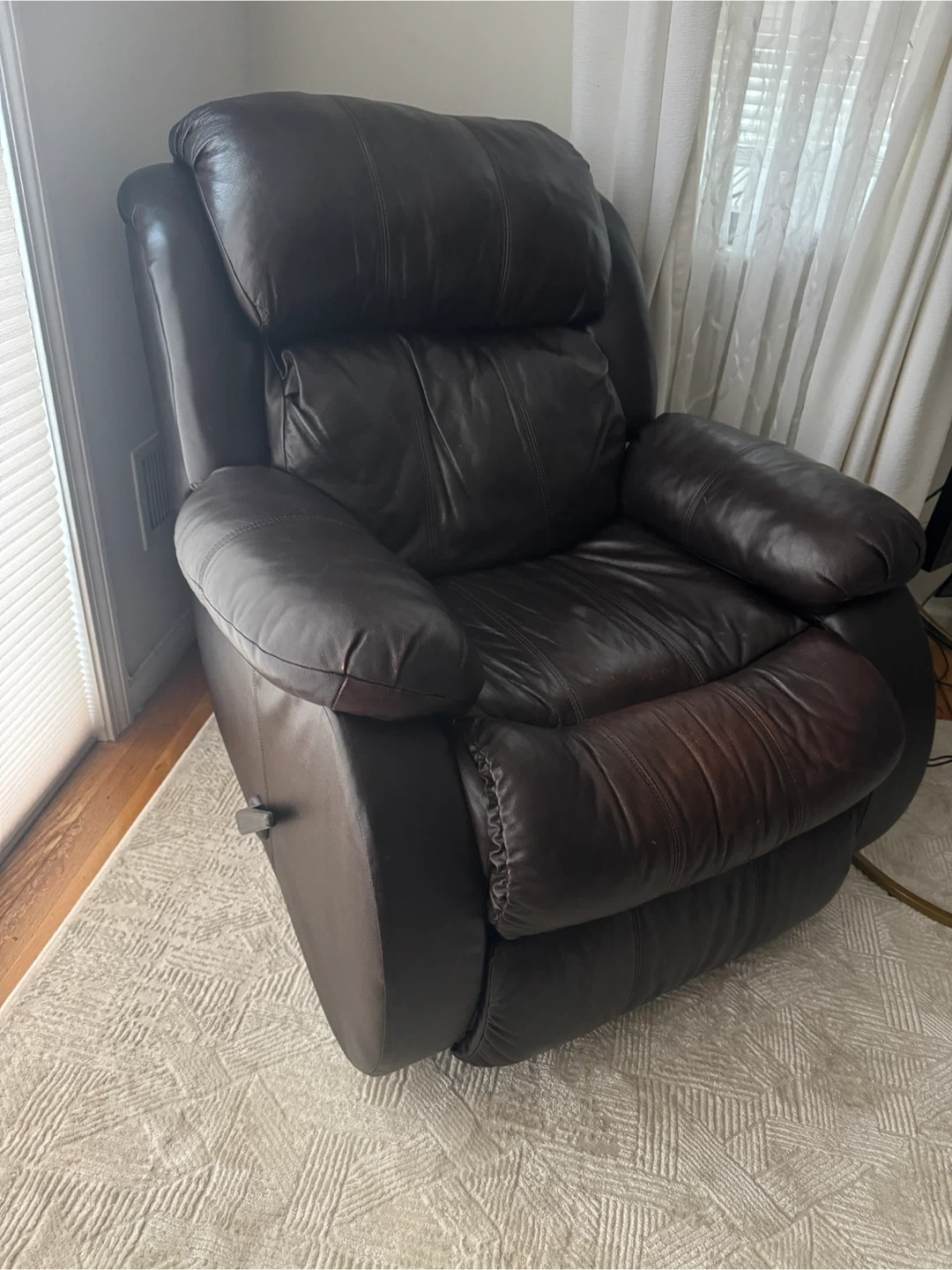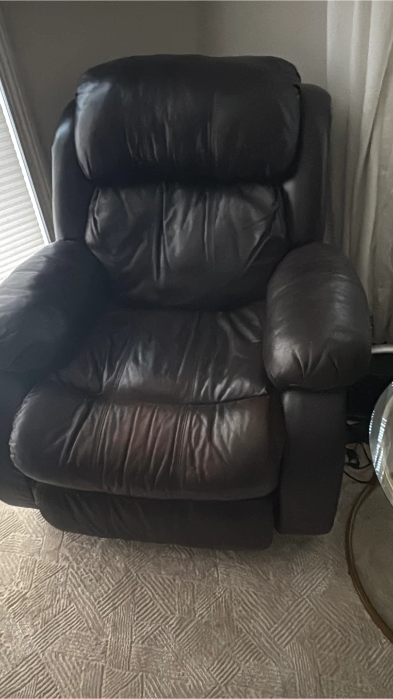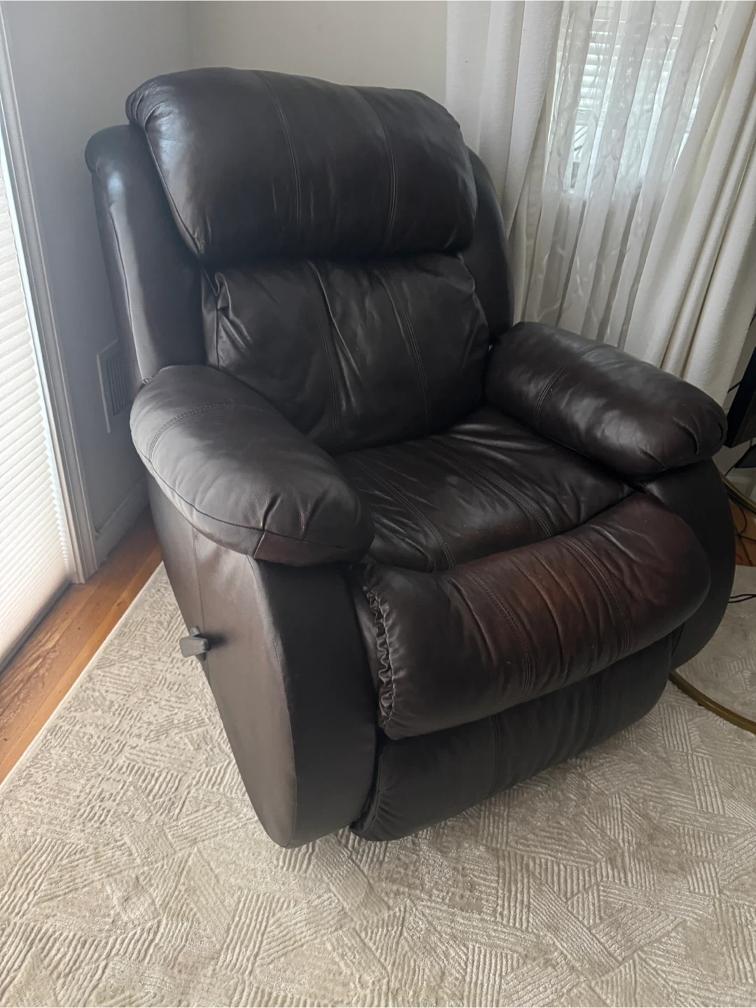 Selling a comfortable brown leather recliner chair. It's in good condition and perfect for relaxing after a long day. The chair features a reclining mechanism for added comfort. Great for any living room or den!