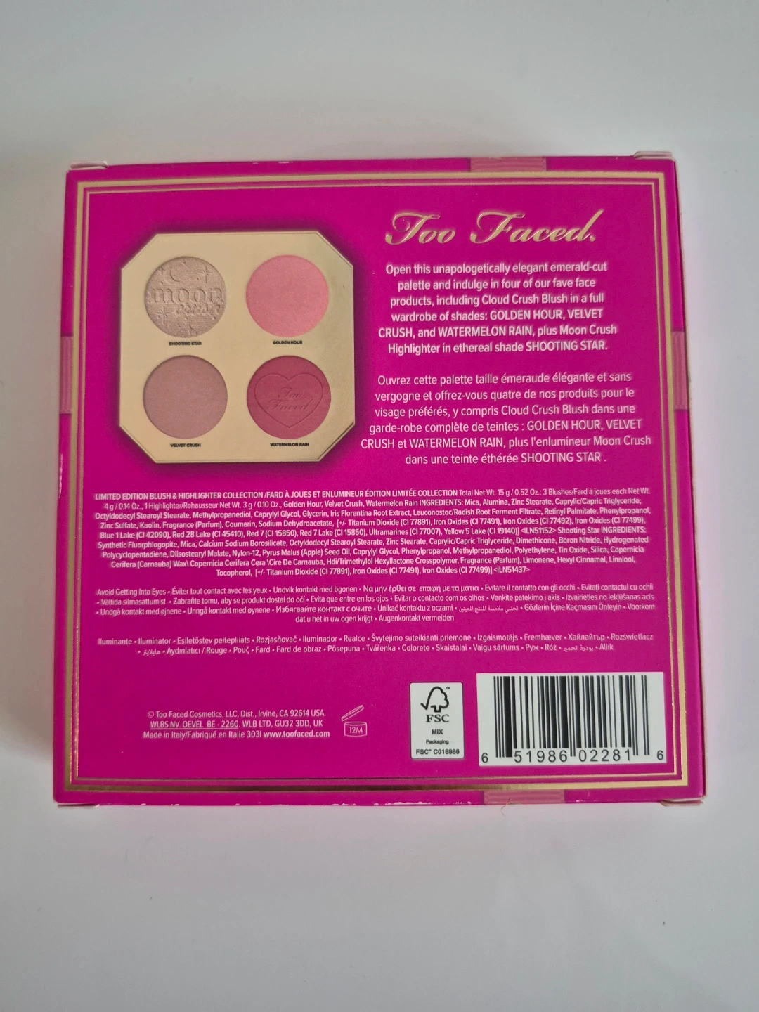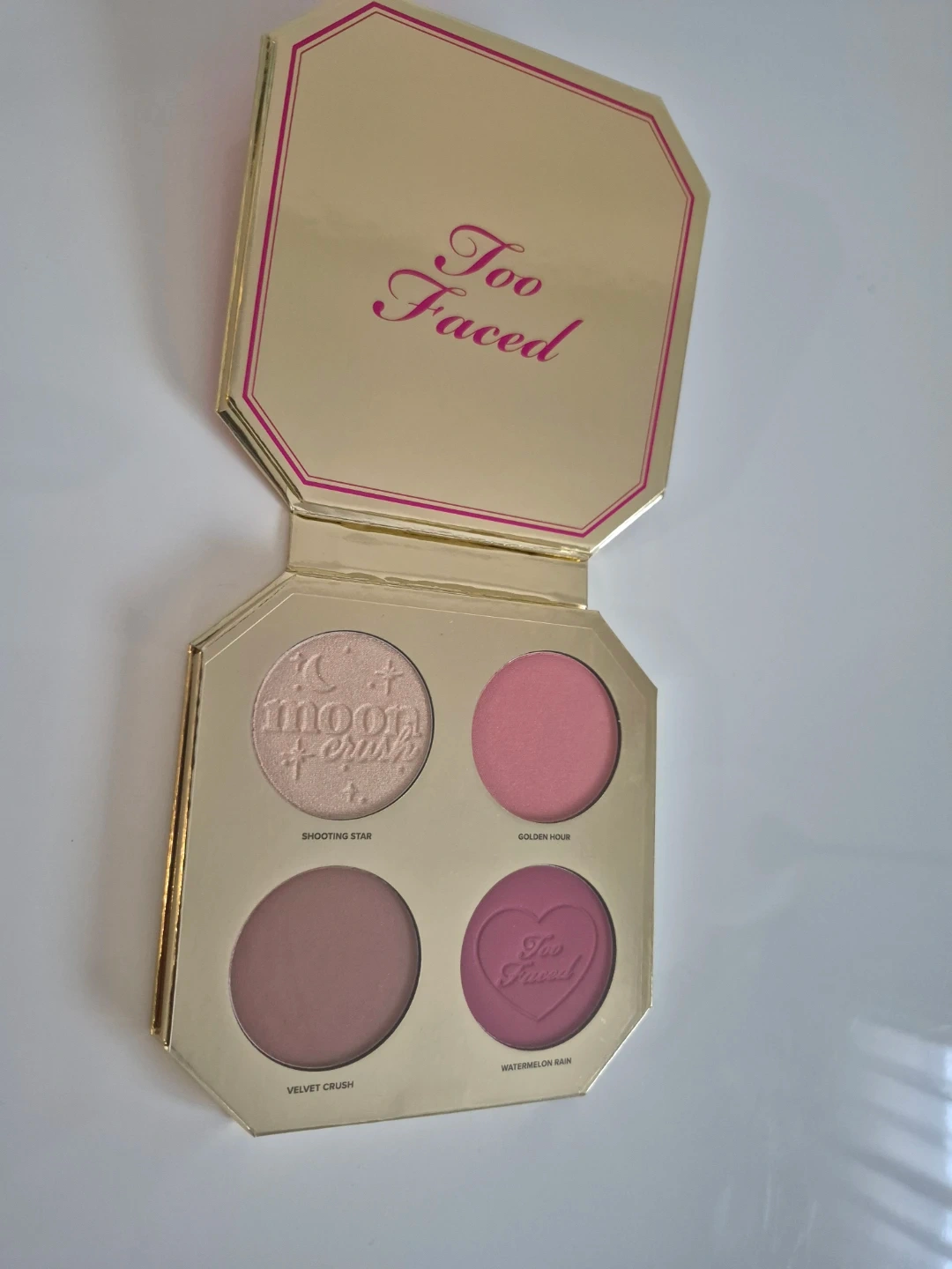 This is a limited edition Too Faced Jewel Crush Blush & Highlighter Collection. It comes with four shades: Shooting Star, Golden Hour, Velvet Crush, and Watermelon Crush.