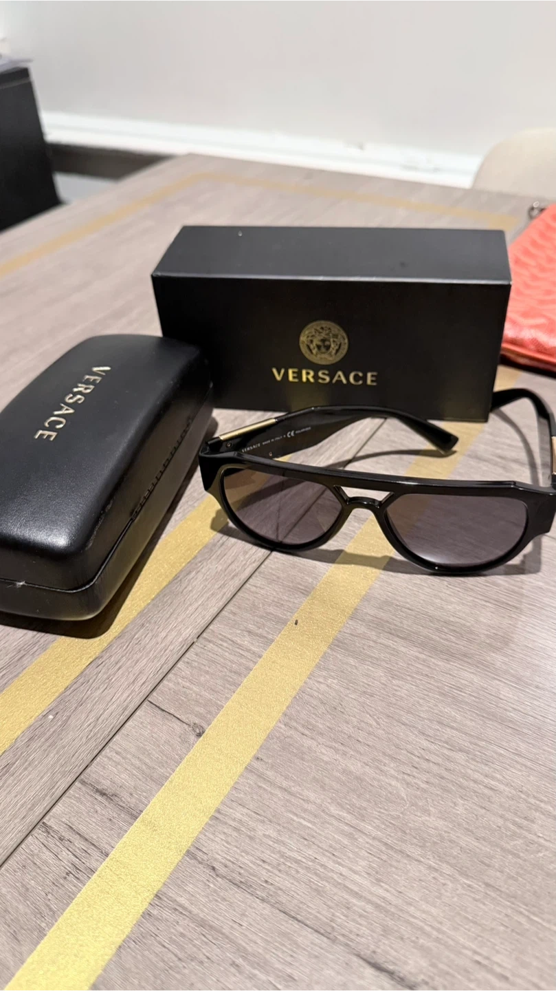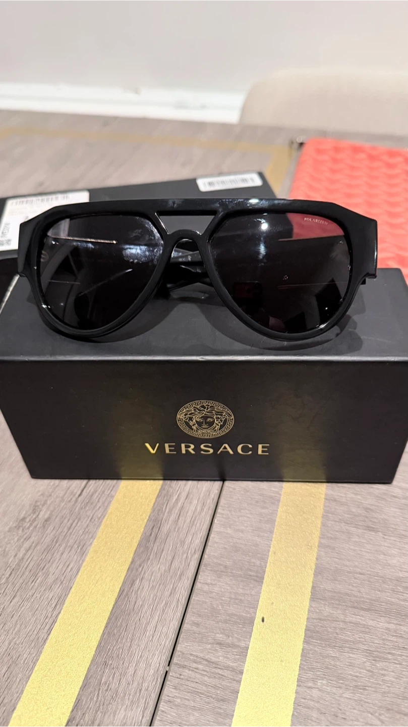 Versace VE3314 sunglasses. Black acetate frame with gold Medusa logo detail. Polarized lenses made in Italy. Comes with original box and case!