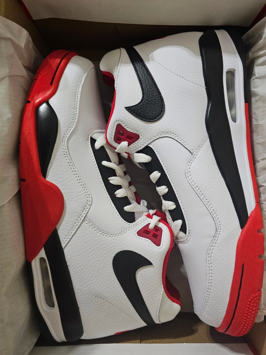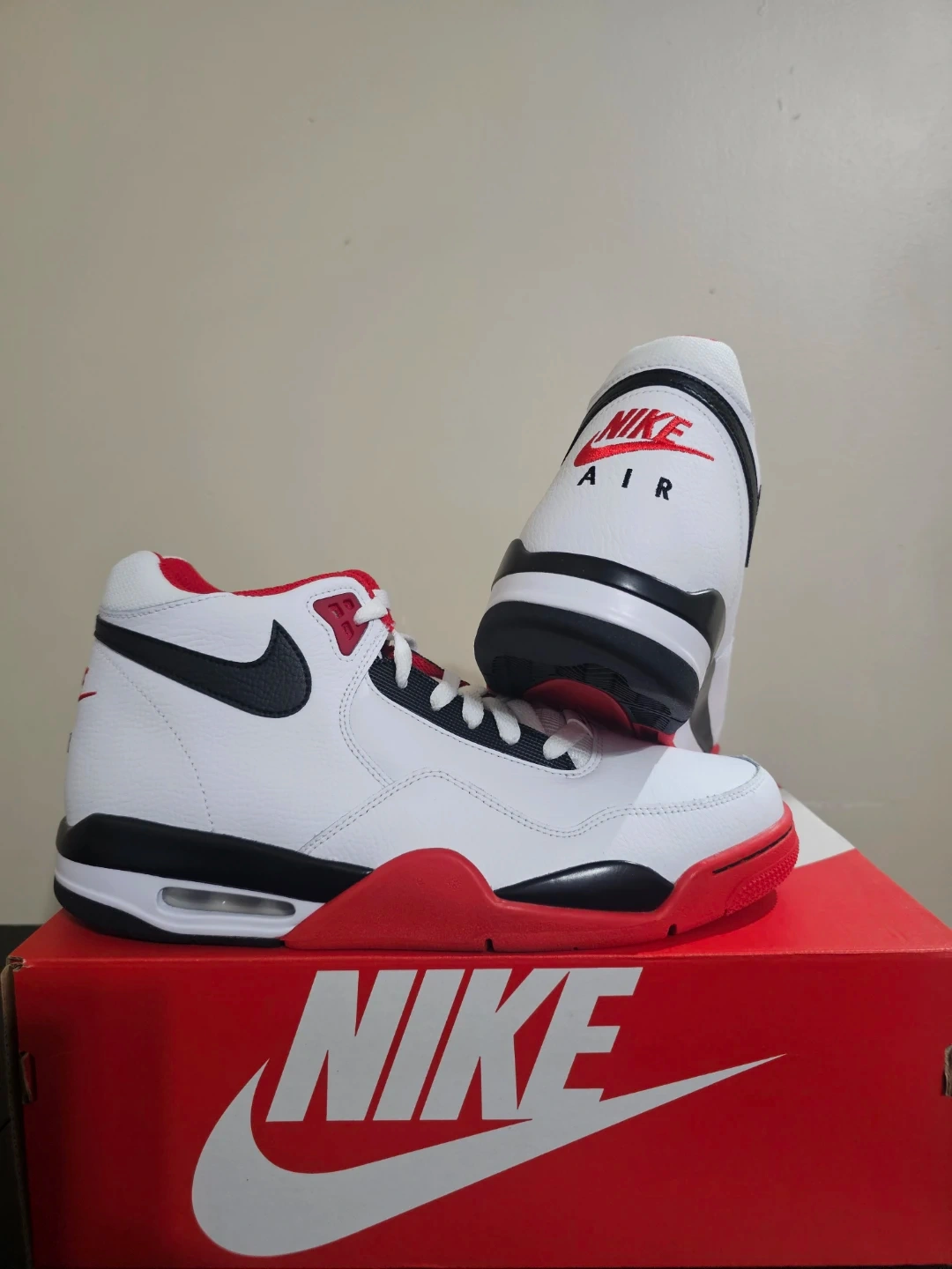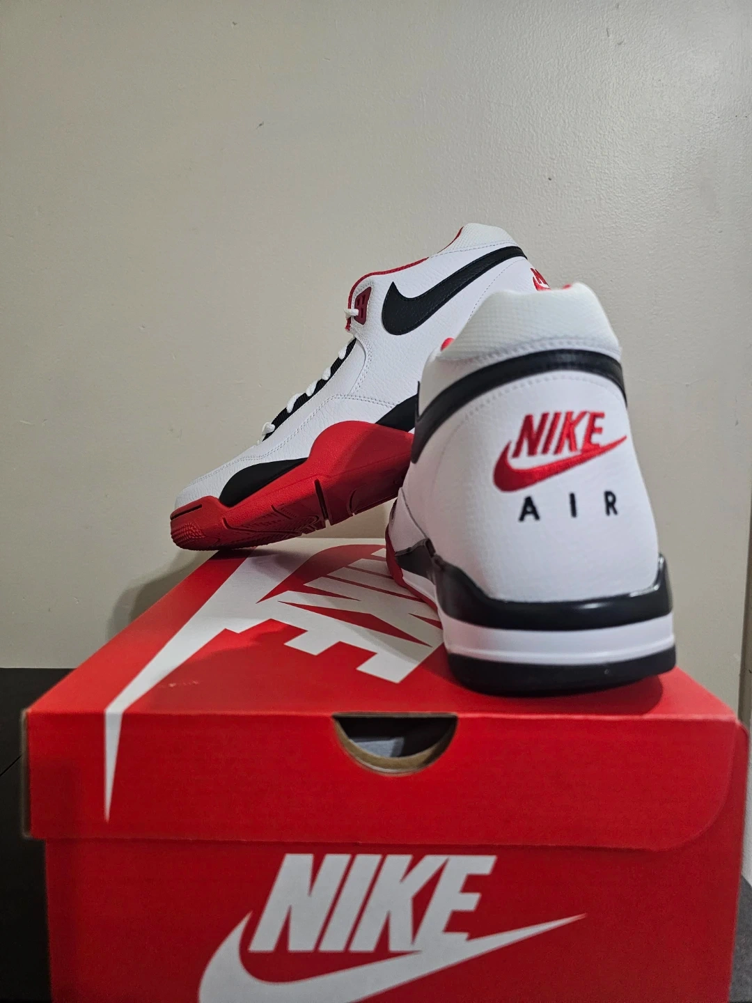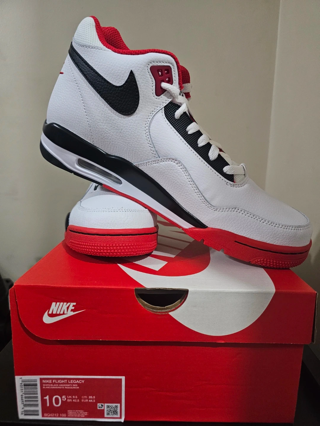 Brand new Nike Flight Legacy shoes in a classic white, black, and red colourway. These basketball-inspired sneakers come in their original box. Size 10.5.