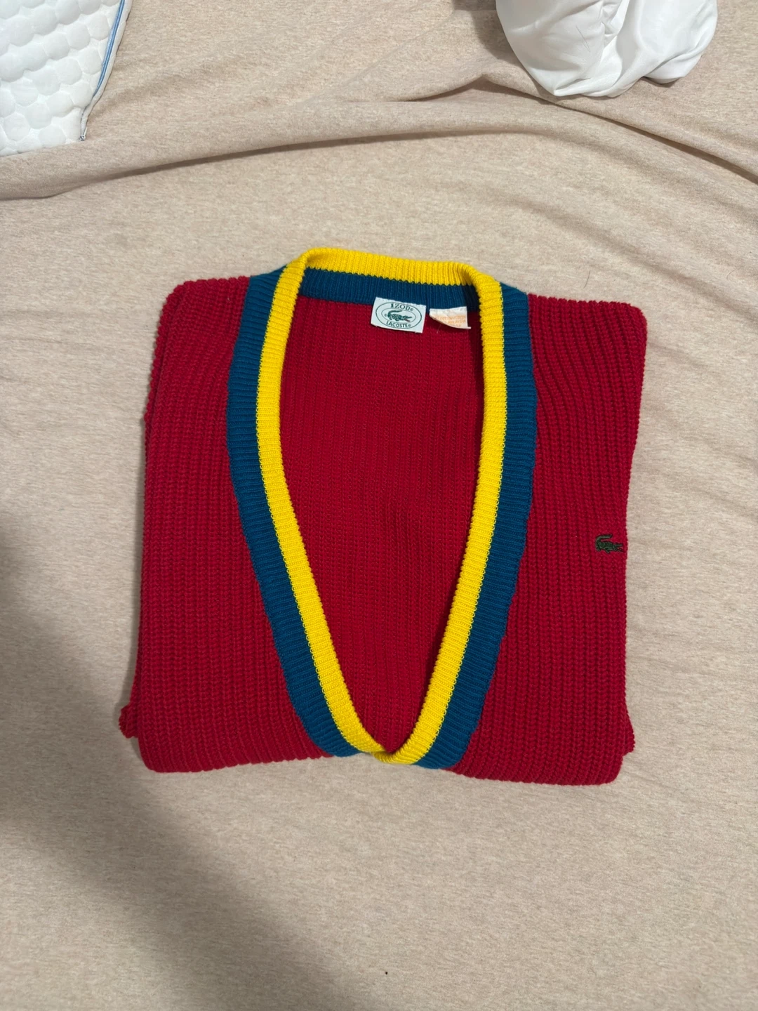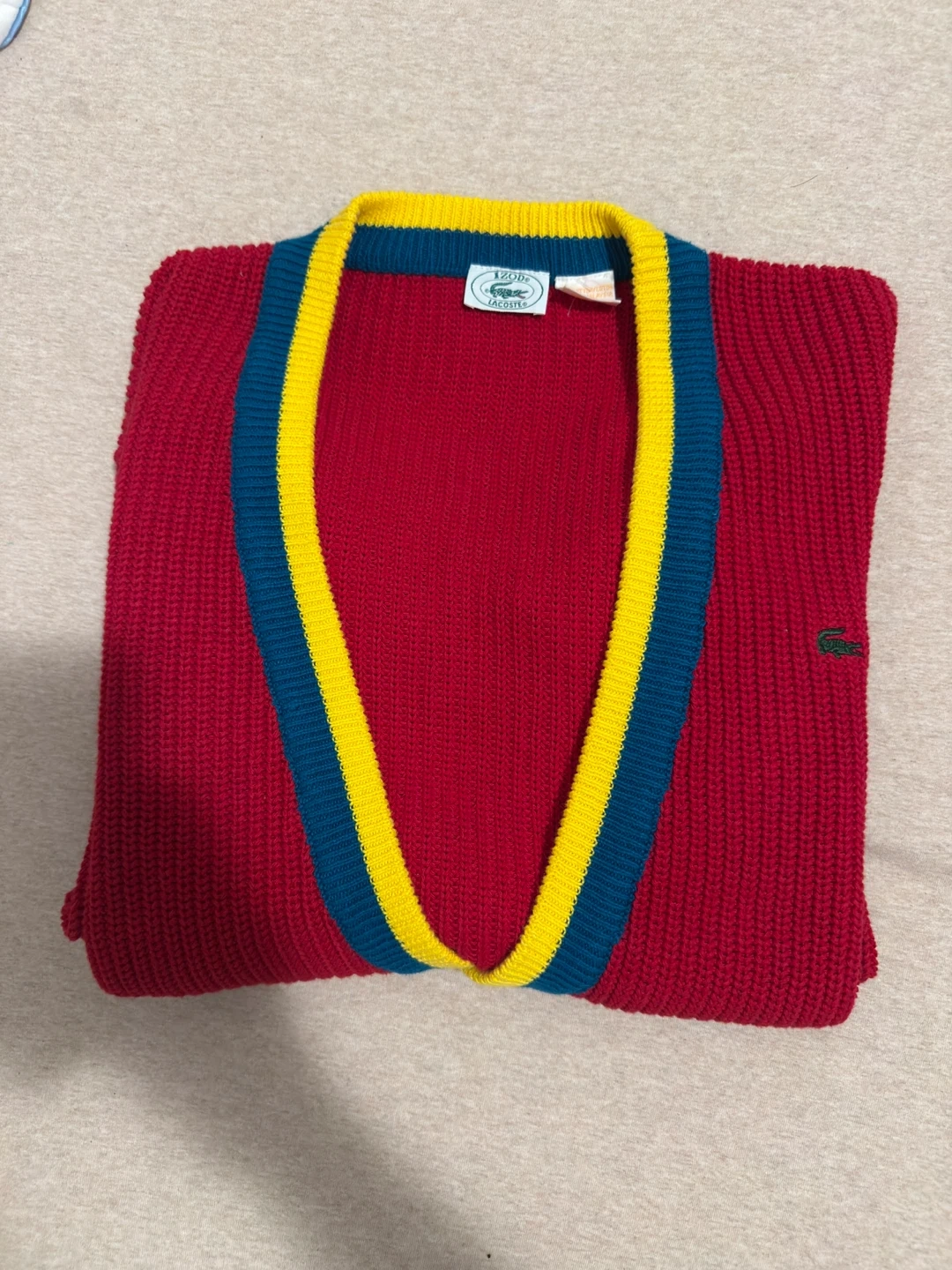 Lacoste Red Knit Cardigan with Yellow and Blue Trim