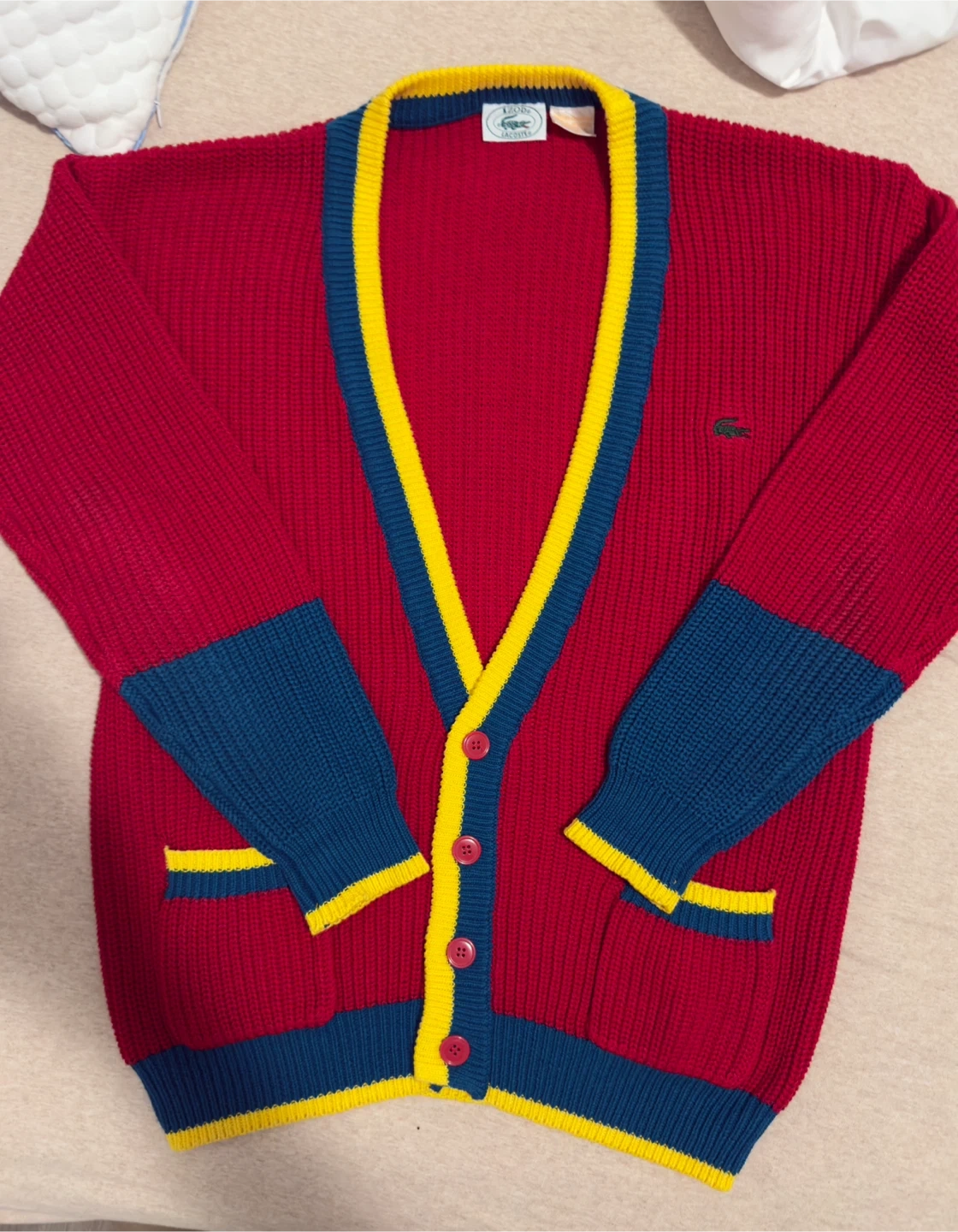 This is a red knit cardigan from Lacoste. It features contrasting yellow and blue trim around the neckline, pockets, and cuffs. Two buttons at the front fasten the cardigan.