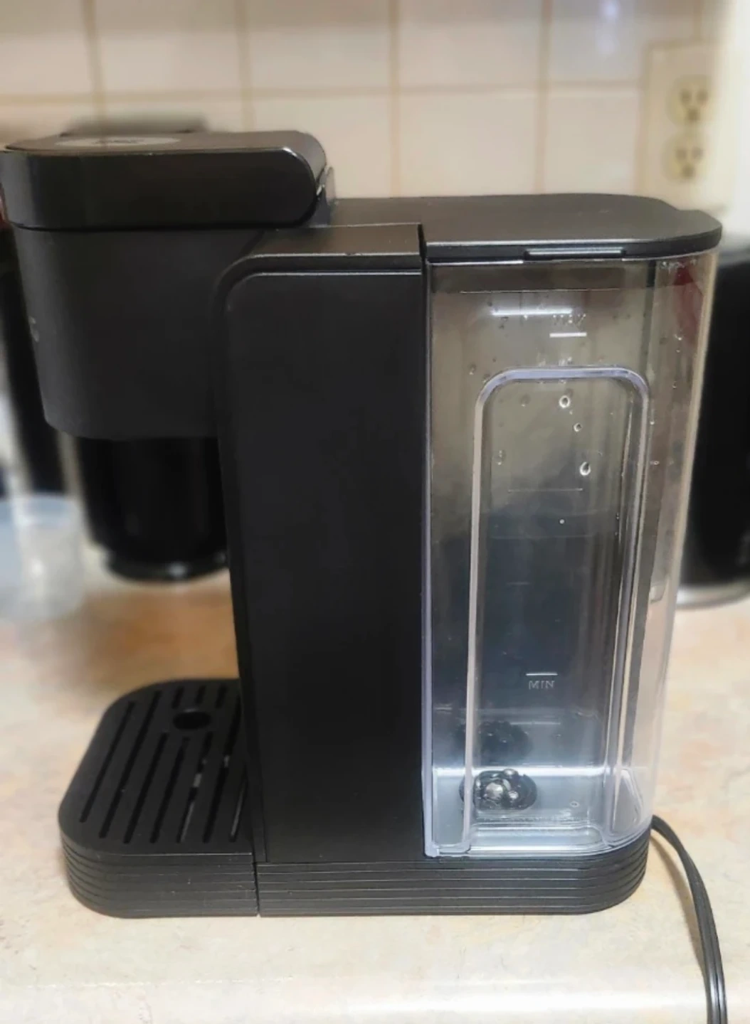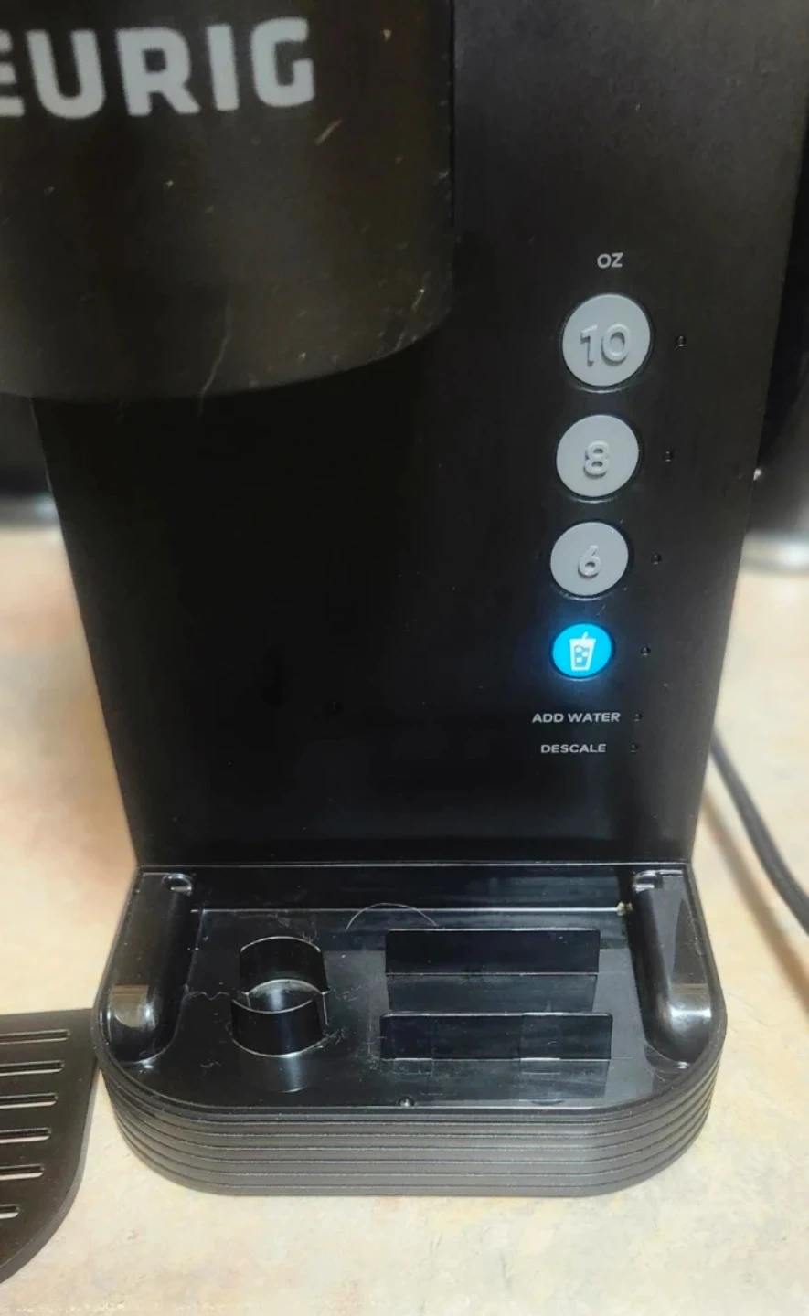 This Keurig coffee maker brews single cups of coffee. It has brew size options for 6, 8, and 10 ounces. The water reservoir is removable for easy filling. It's a convenient appliance for quick coffee.