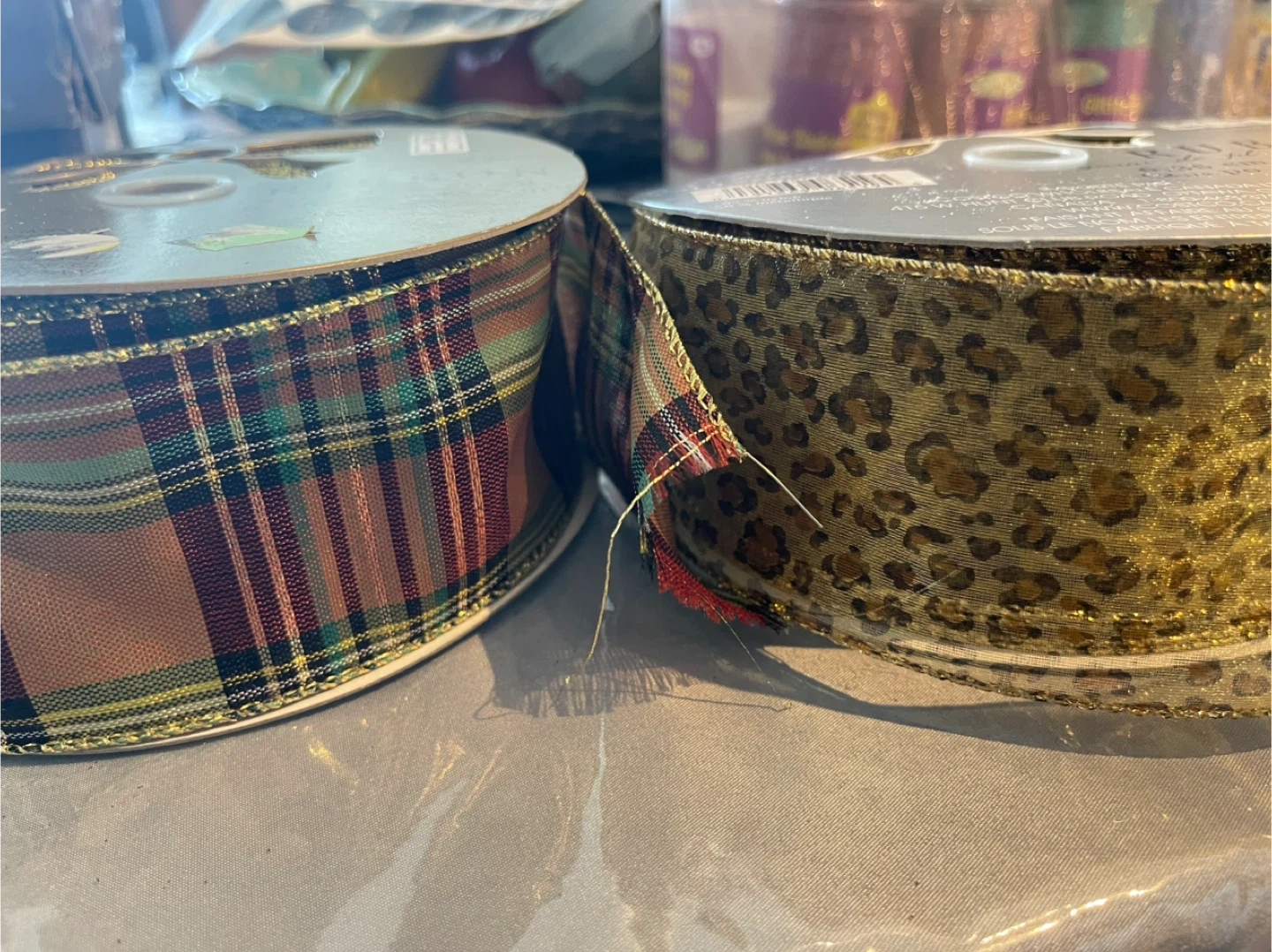 Three spools of ribbon perfect for holiday decorating. One spool is red with a snowflake design, another is gold with a leopard print, and the third features a classic plaid pattern. All are wired for easy shaping and decorating. price for all 3 spools