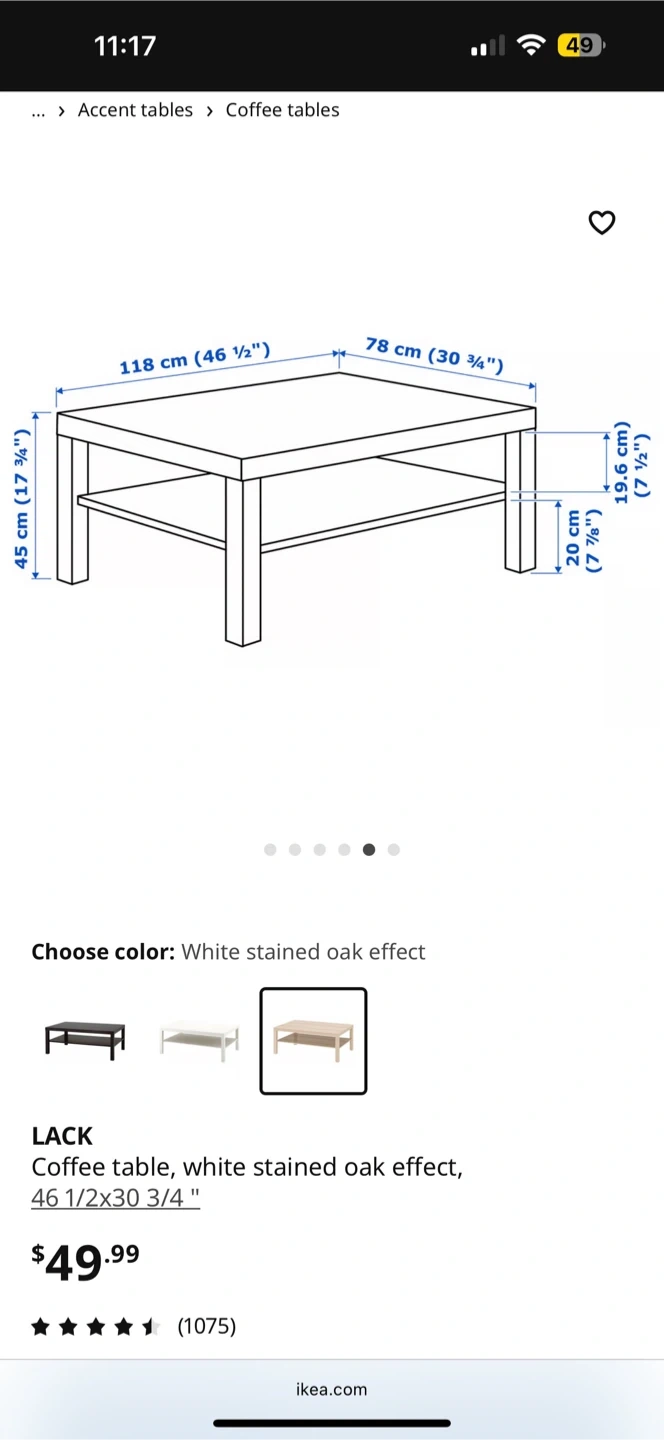 This is the IKEA LACK coffee table in a white stained oak effect finish. It's 46 1/2" x 30 3/4" and 17 3/4" tall. Comes with a lower shelf for extra storage space!