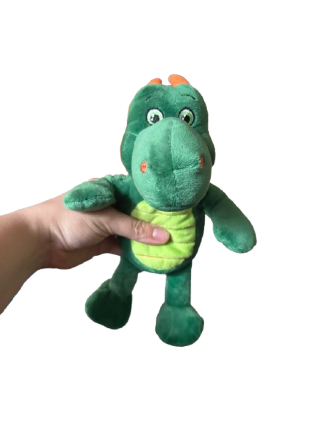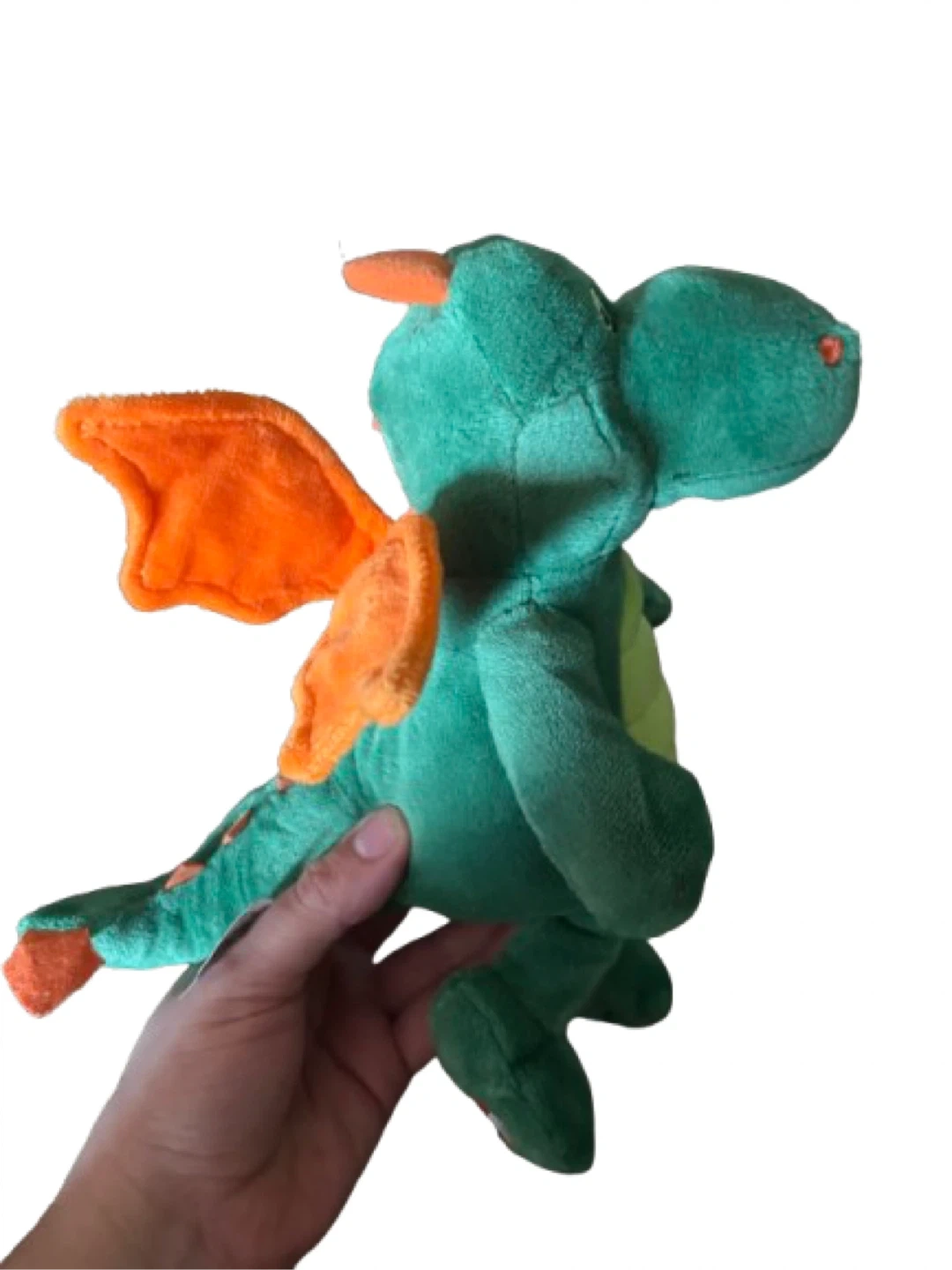 This adorable green dragon plush is the perfect cozy companion. Soft, friendly, and kid‑safe, with embroidered eyes and bright orange wings and spikes. Clean, cuddly, and ready for a new home.