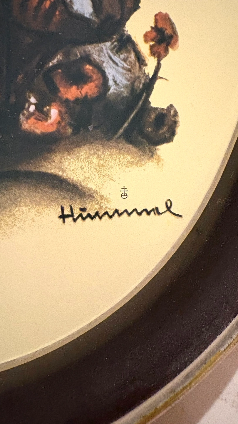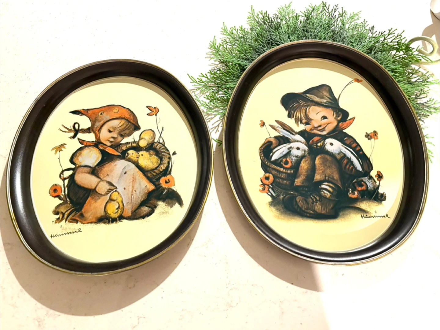 Adorable vintage set of two metal oval trays featuring classic Hummel artwork.