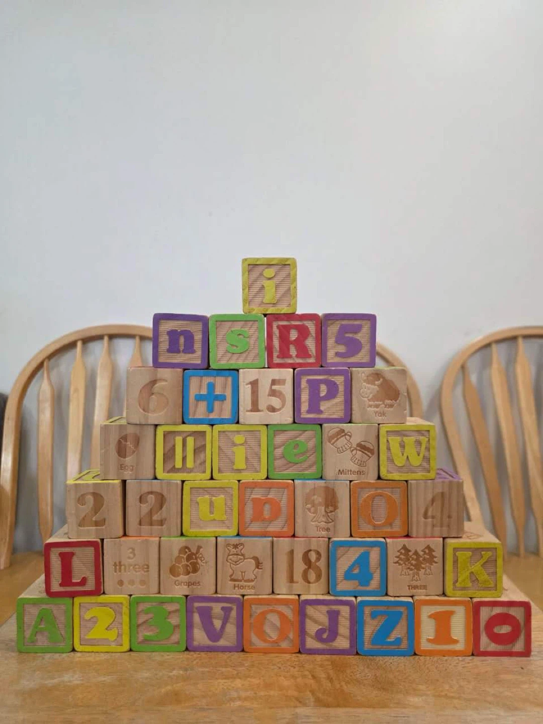 This set includes wooden blocks with letters, numbers, and pictures. They're great for early learning and play. Each block is made of wood and features colourful designs.