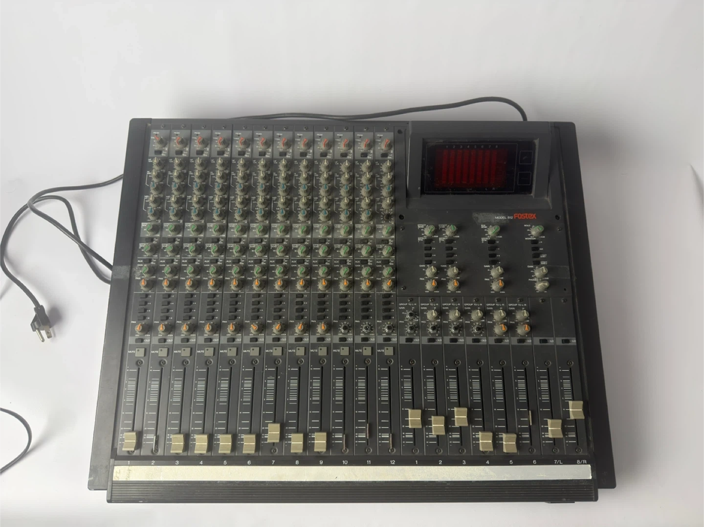 This is a Fostex 12 channel mixer. It has 12 mono inputs and 4 stereo inputs. It features 3-band EQ on all channels and phantom power. It's great for live sound or studio recording!