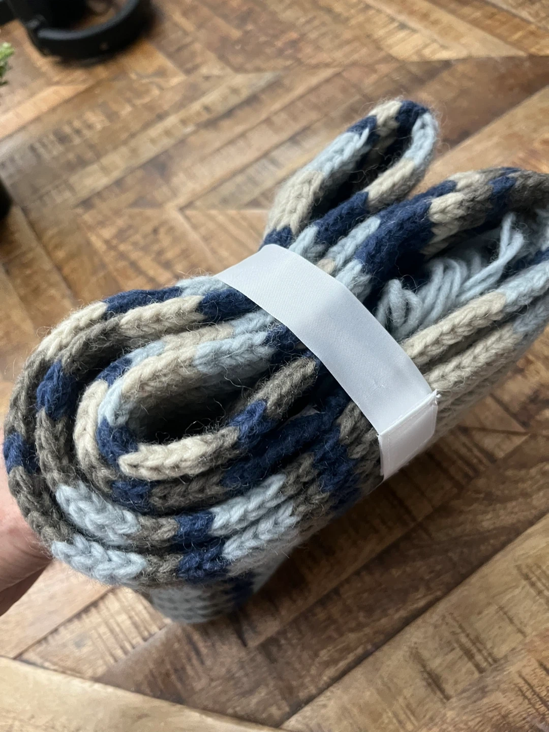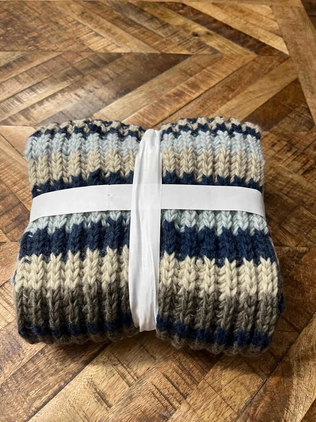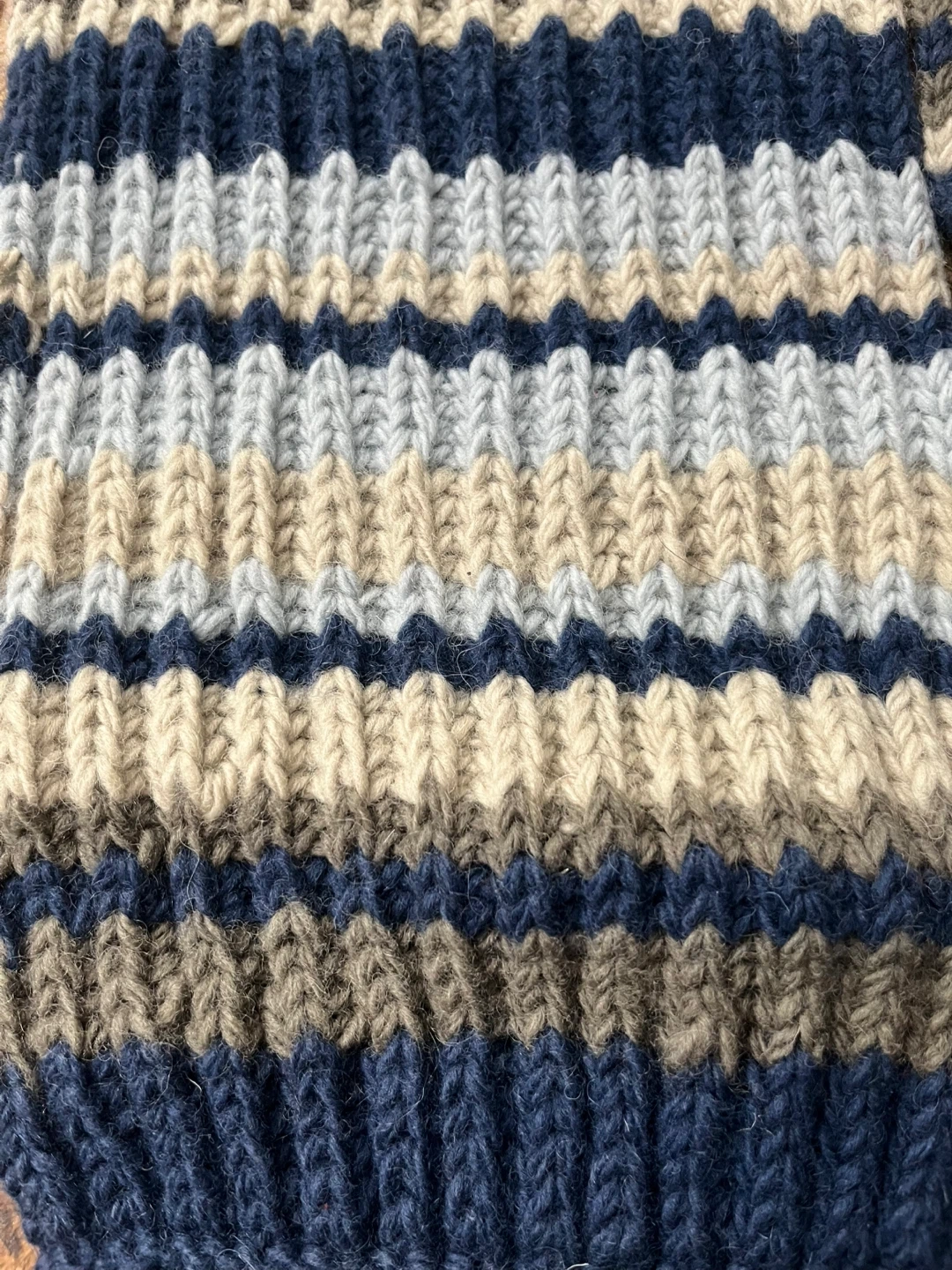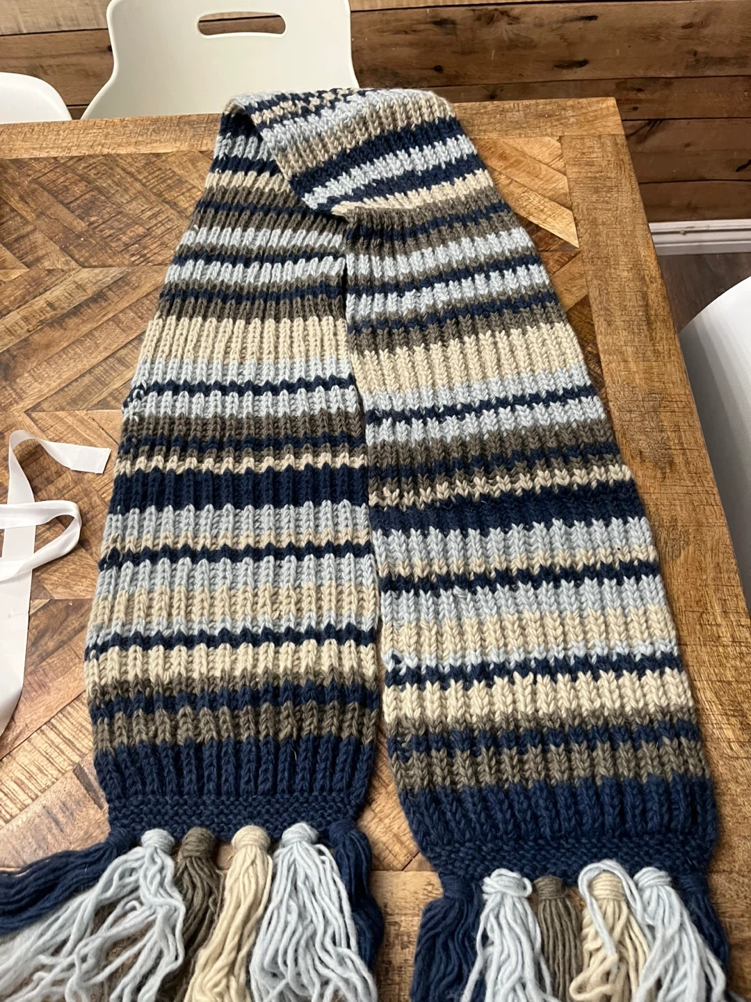 🥕A cozy knit scarf featuring a striped pattern in navy, tan, light blue, and grey. It's finished with a row of fun tassels. Perfect for adding warmth and style to your winter outfits! Never used.