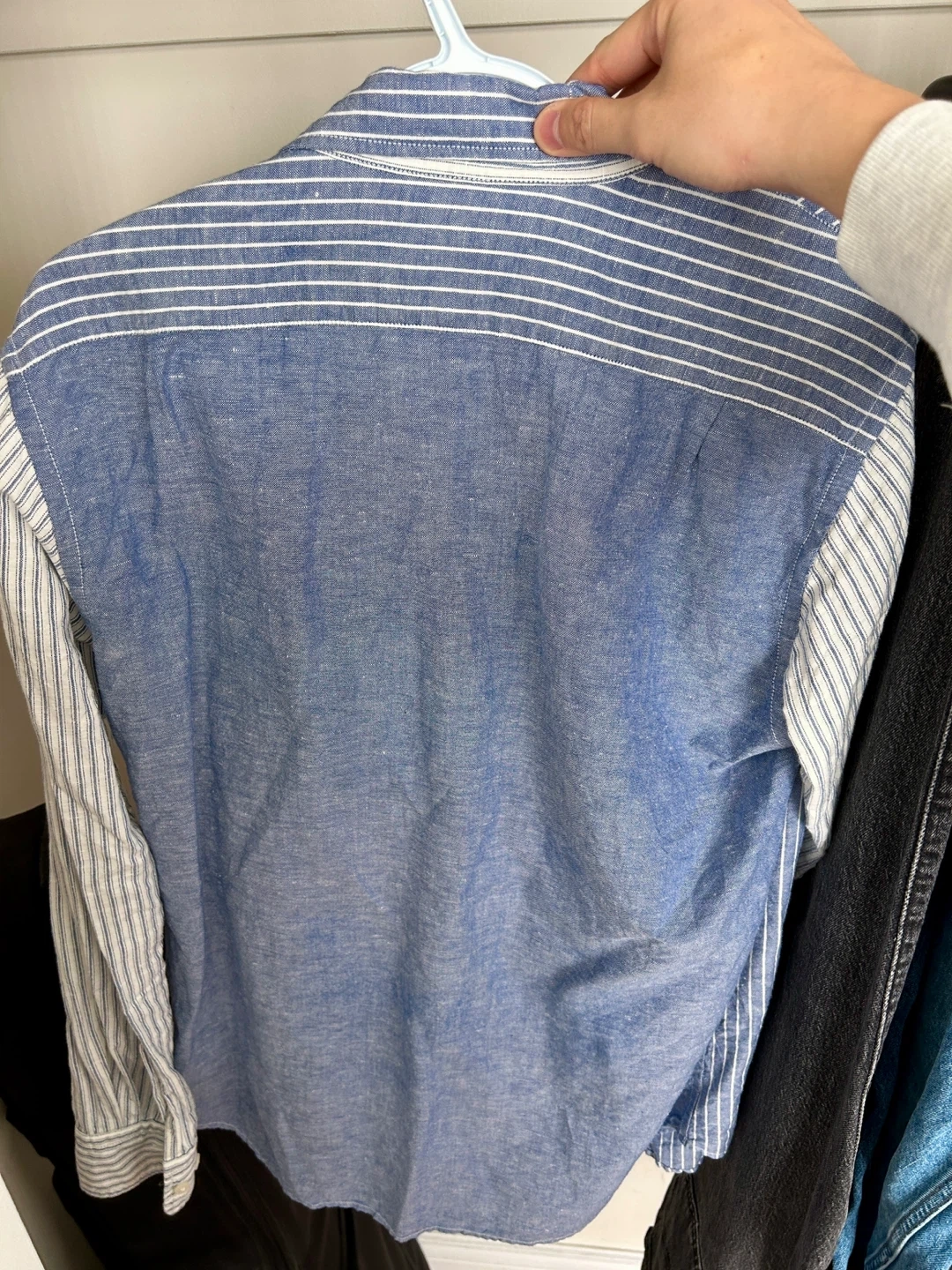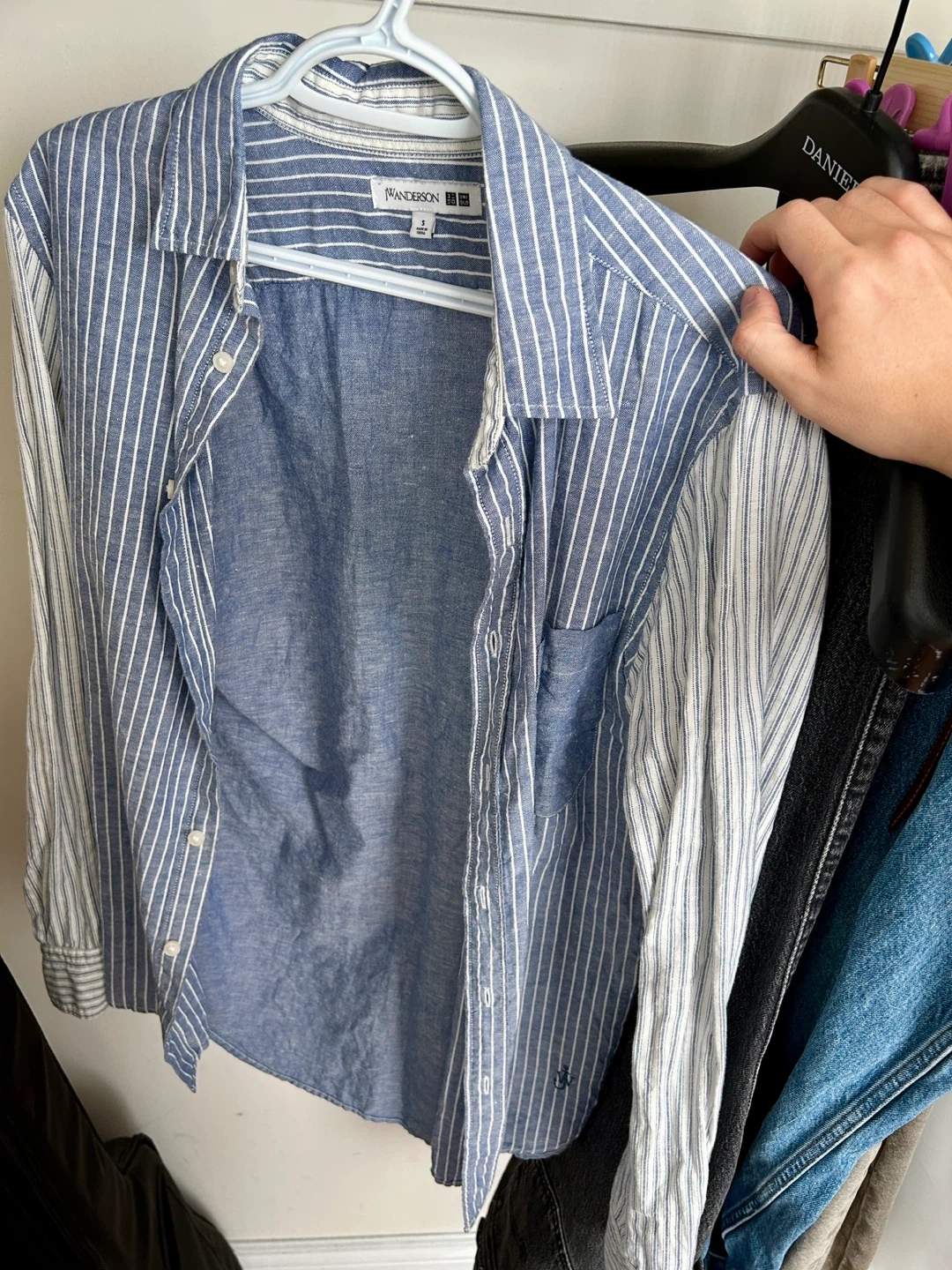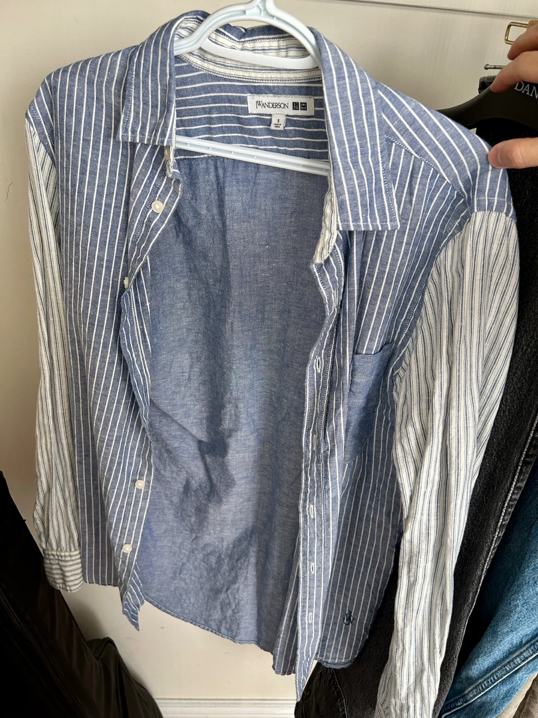 36Selling a JW Anderson x Uniqlo shirt with a unique striped design! It's a stylish and comfortable piece, perfect for adding a touch of flair to your wardrobe. The shirt features a mix of vertical and horizontal stripes in blue and white, giving it a distinctive look. Size S (Fit for M too!)
