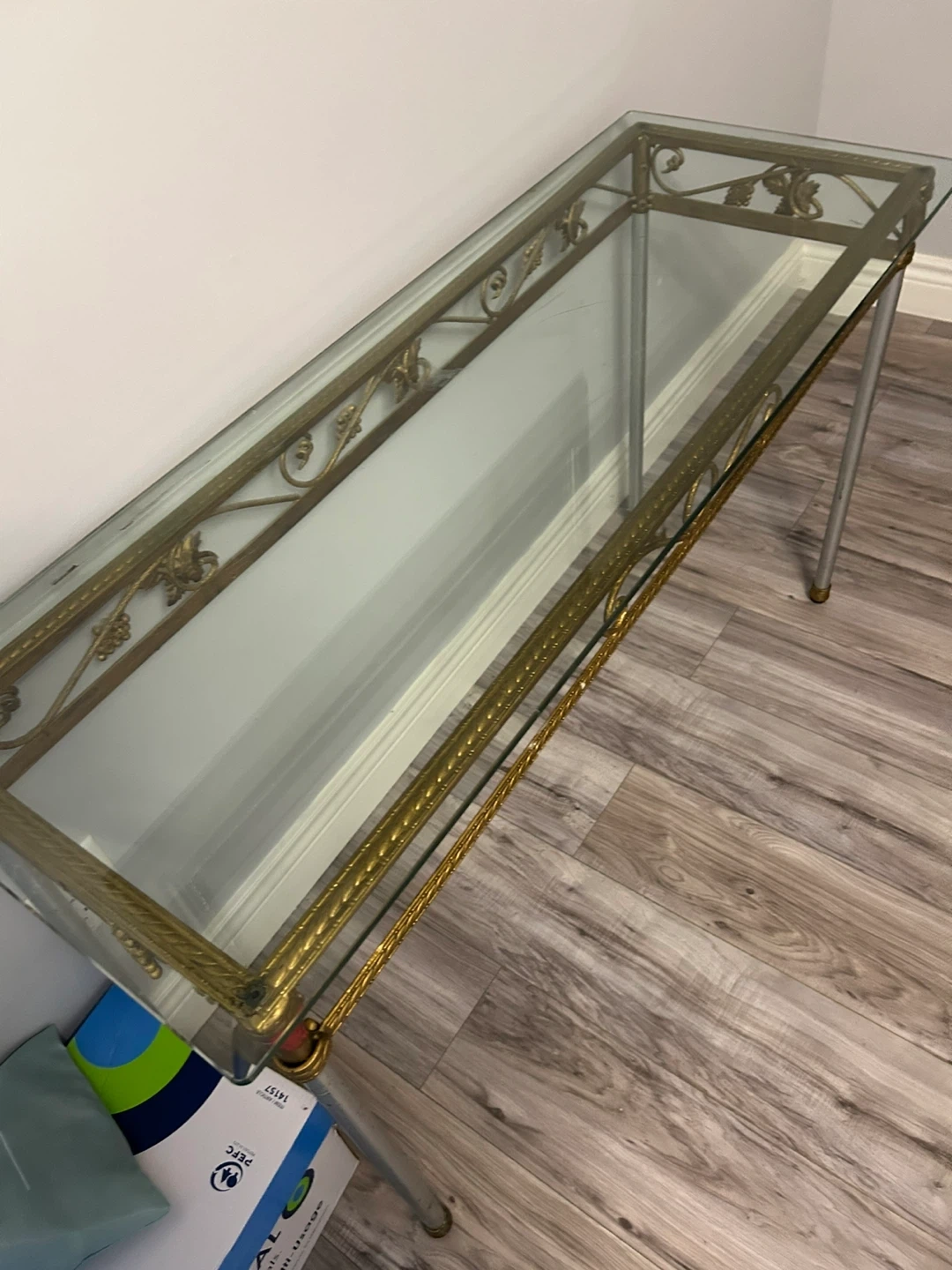 This console table features a clear glass top with ornate gold metal accents. Its slim profile makes it a great accent piece for hallways or entryways. It's constructed with metal legs and a glass surface.