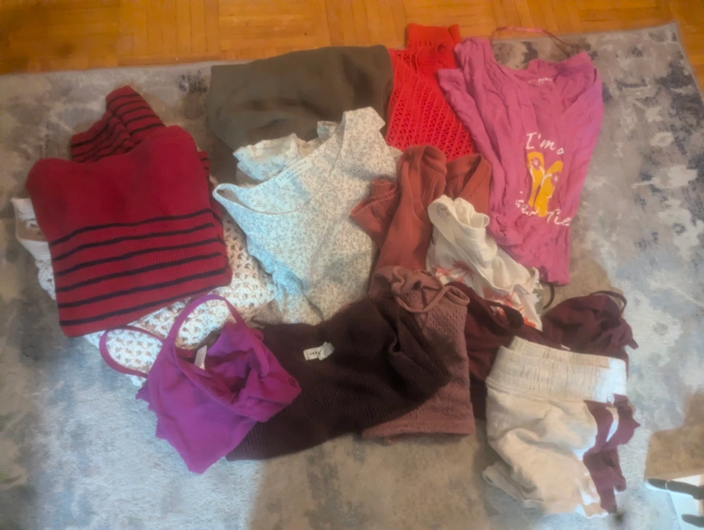 This is a bundle of assorted women's tops. Includes a red striped sweater, a pink graphic tee with flip-flops that says "I'm so happy", a red crocheted top, and other blouses in various colours and patterns. Some pieces have floral prints.